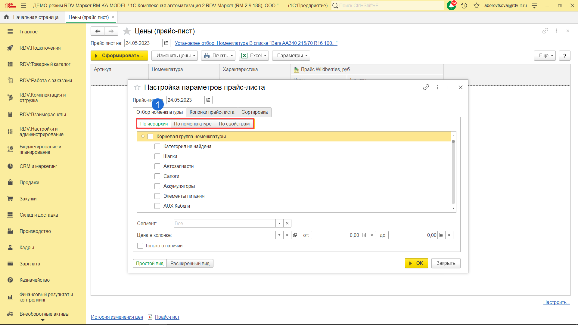 - По иерархии - установить отбор по иерархии номенклатуры.