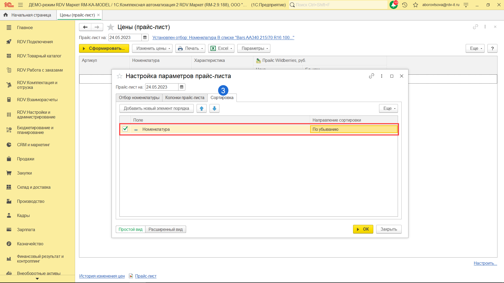 3. "Сортировка" - на данной вкладке, при необходимости, можно настроить сортировку товаров в прайс-листе.