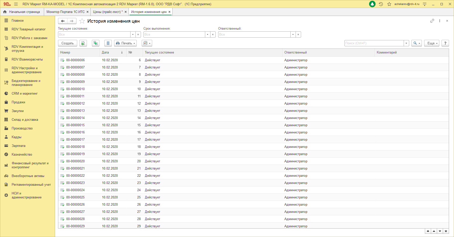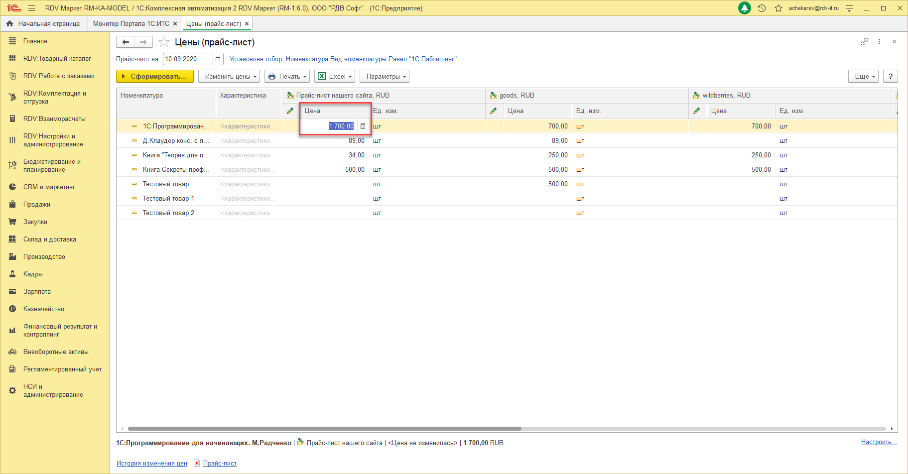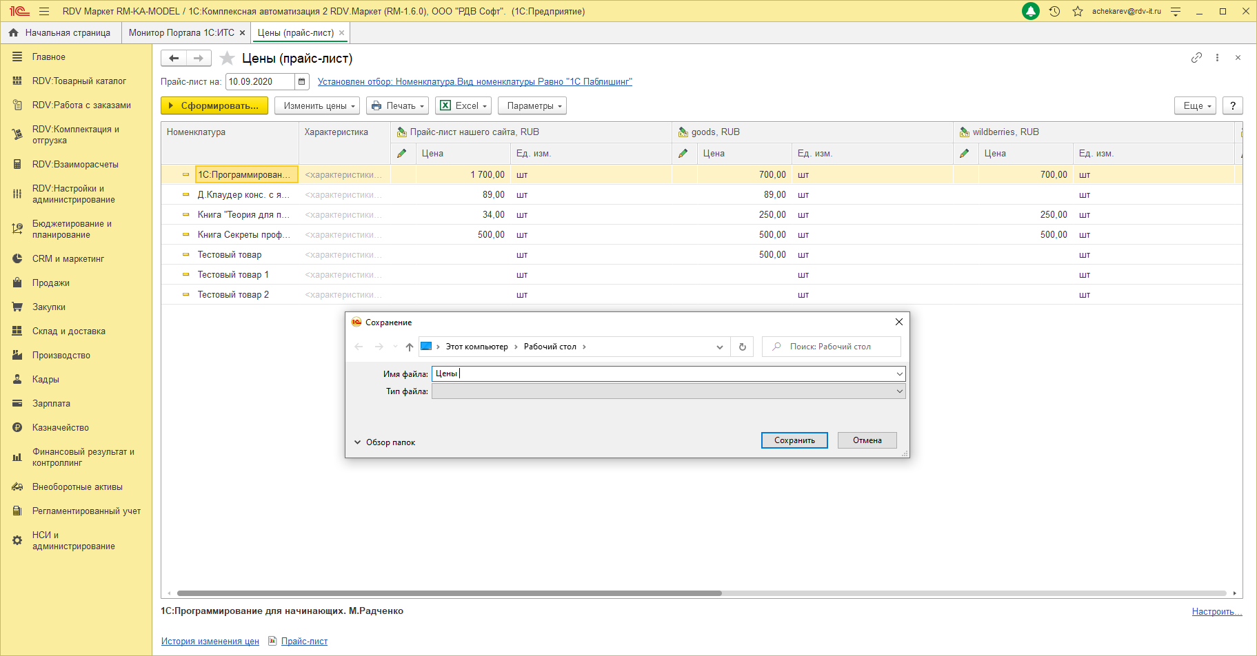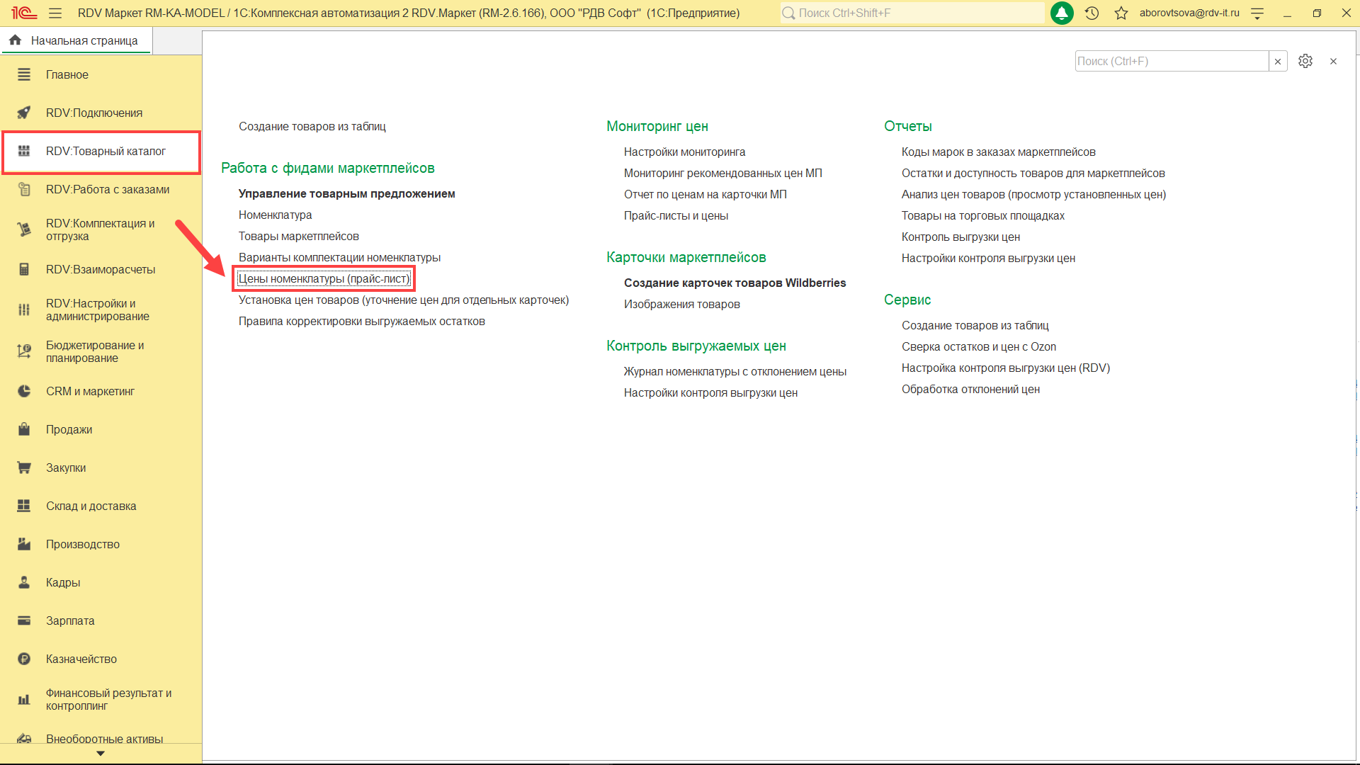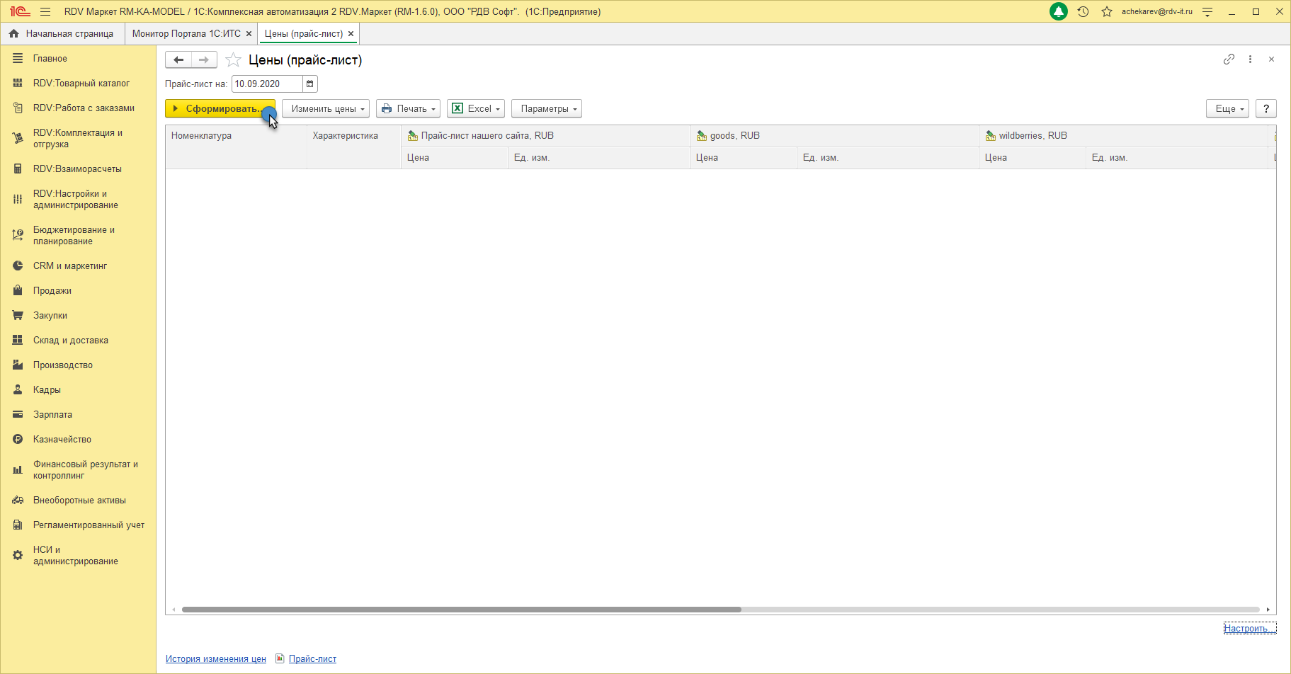 Для создания/обновления прайс-листа перейдите в раздел "RDV: Товарный каталог" - "Цены номенклатуры (прайс-лист)".