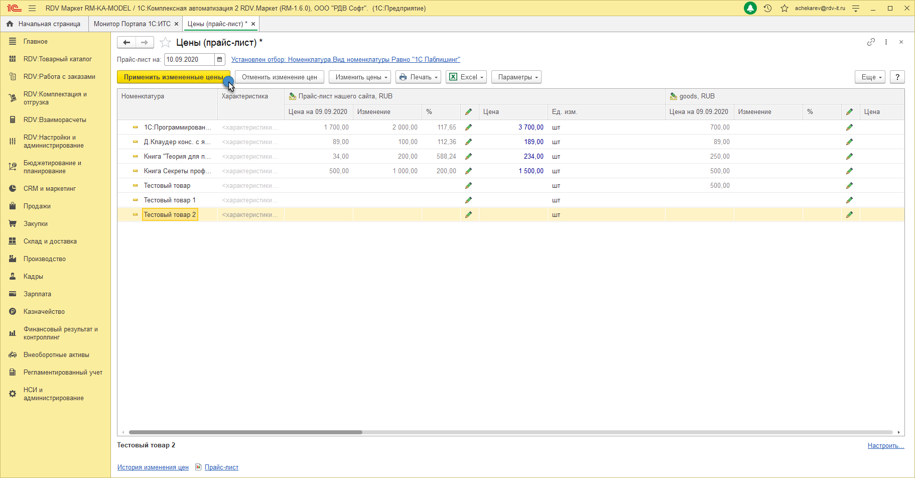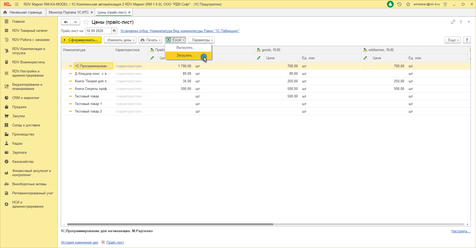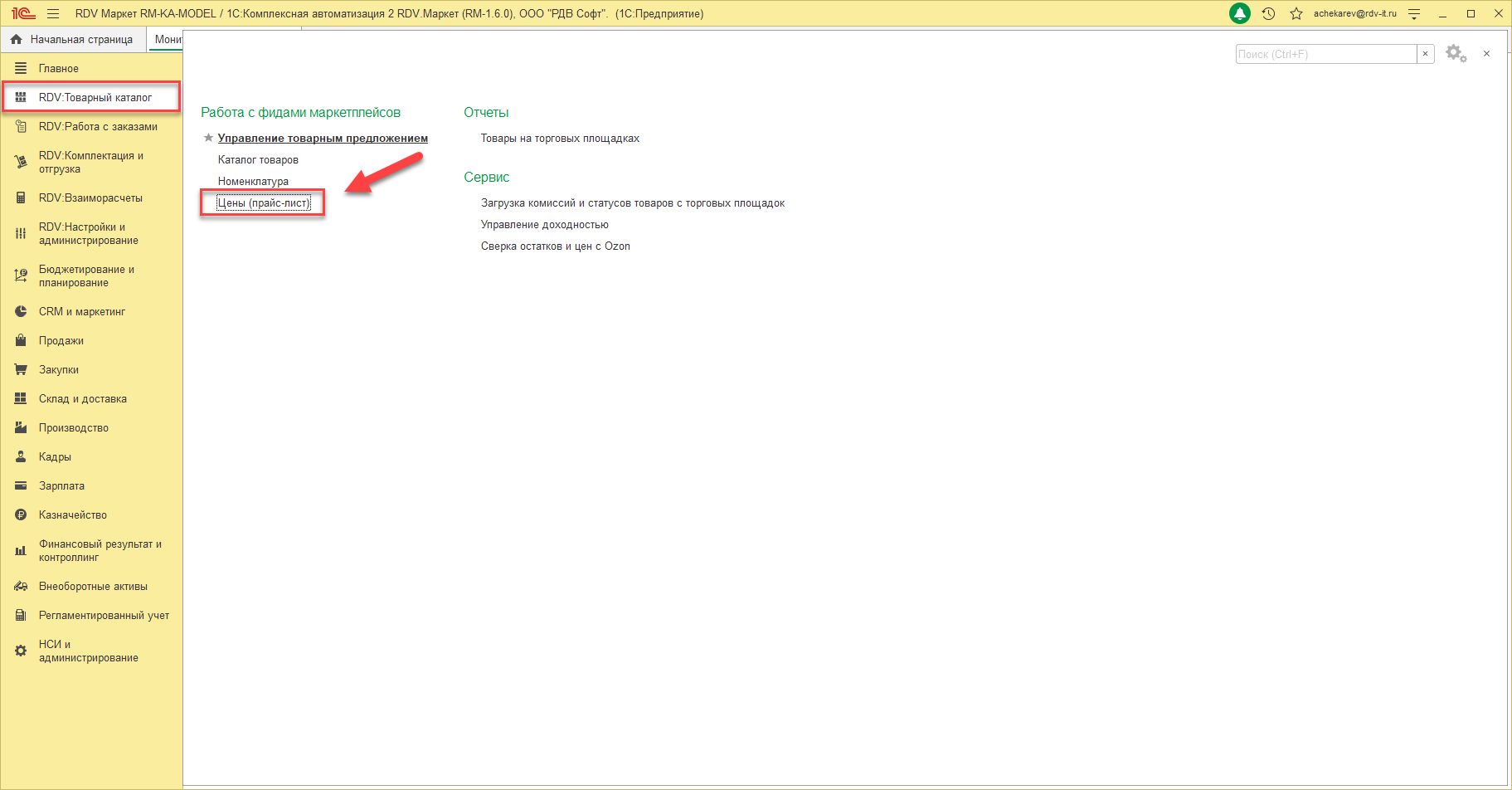 Для создания/обновления прайс-листа, перейдите в раздел "RDV: Товарный каталог - Цены (прайс-лист)":