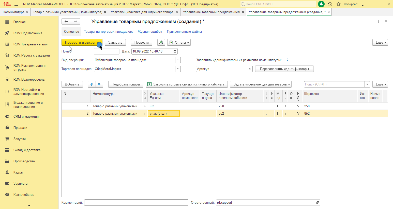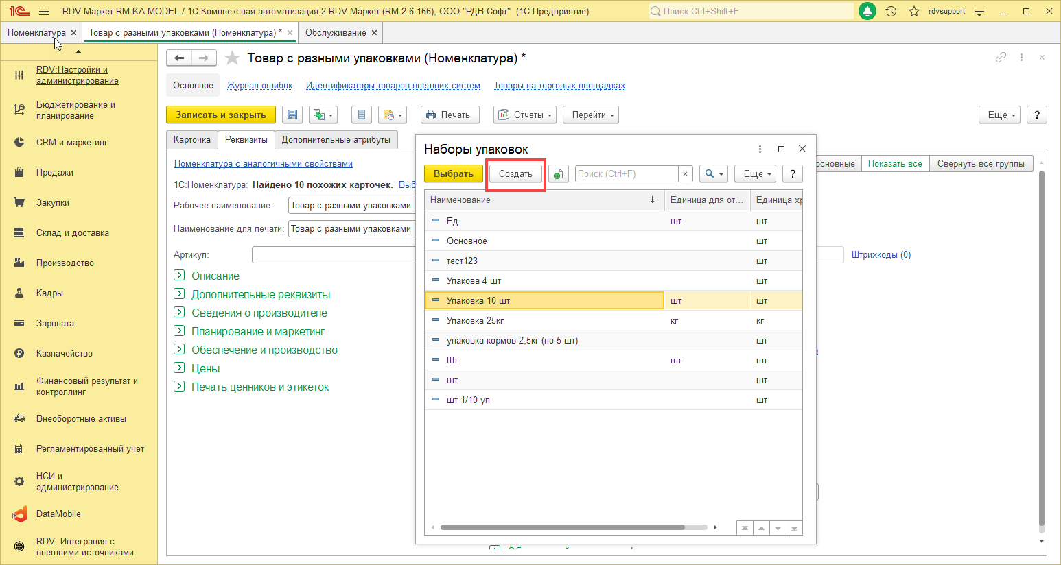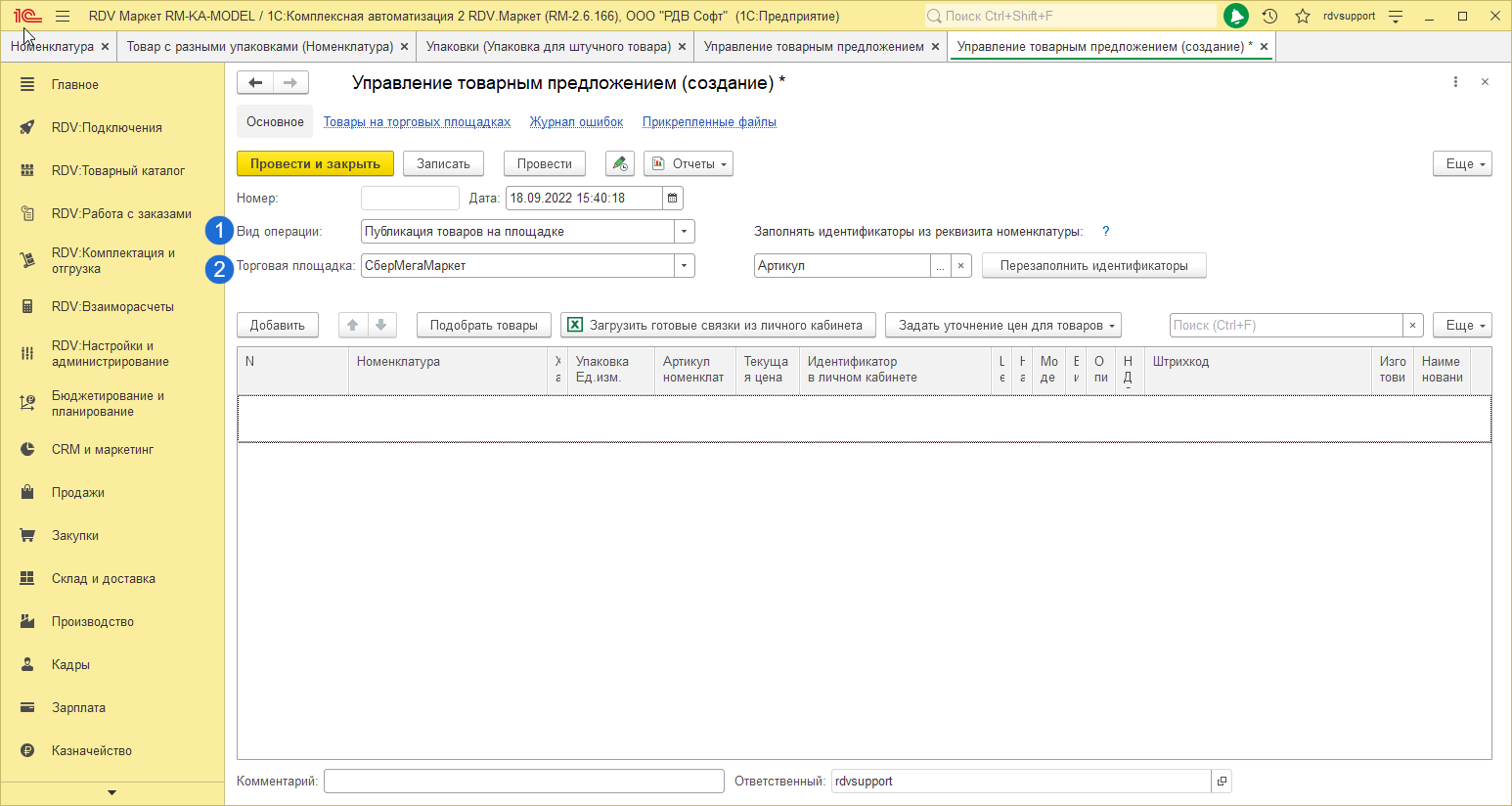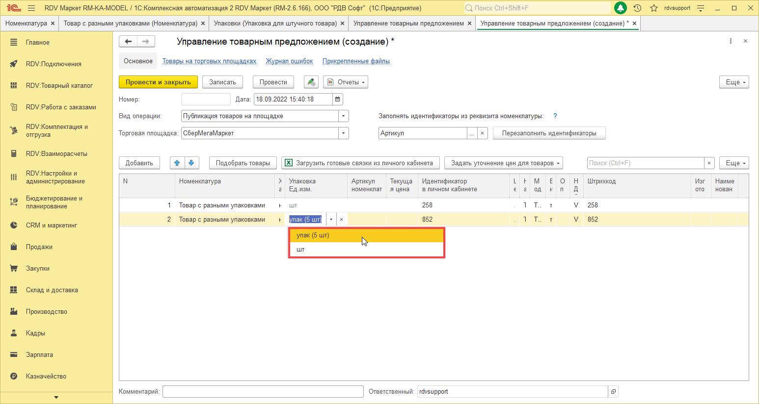Для того, чтобы связать номенклатуру с учетом упаковки и товар маркетплейса, необходимо перейти в раздел RDV: Товарный каталог - Управление товарным предложением и нажать на кнопку Создать