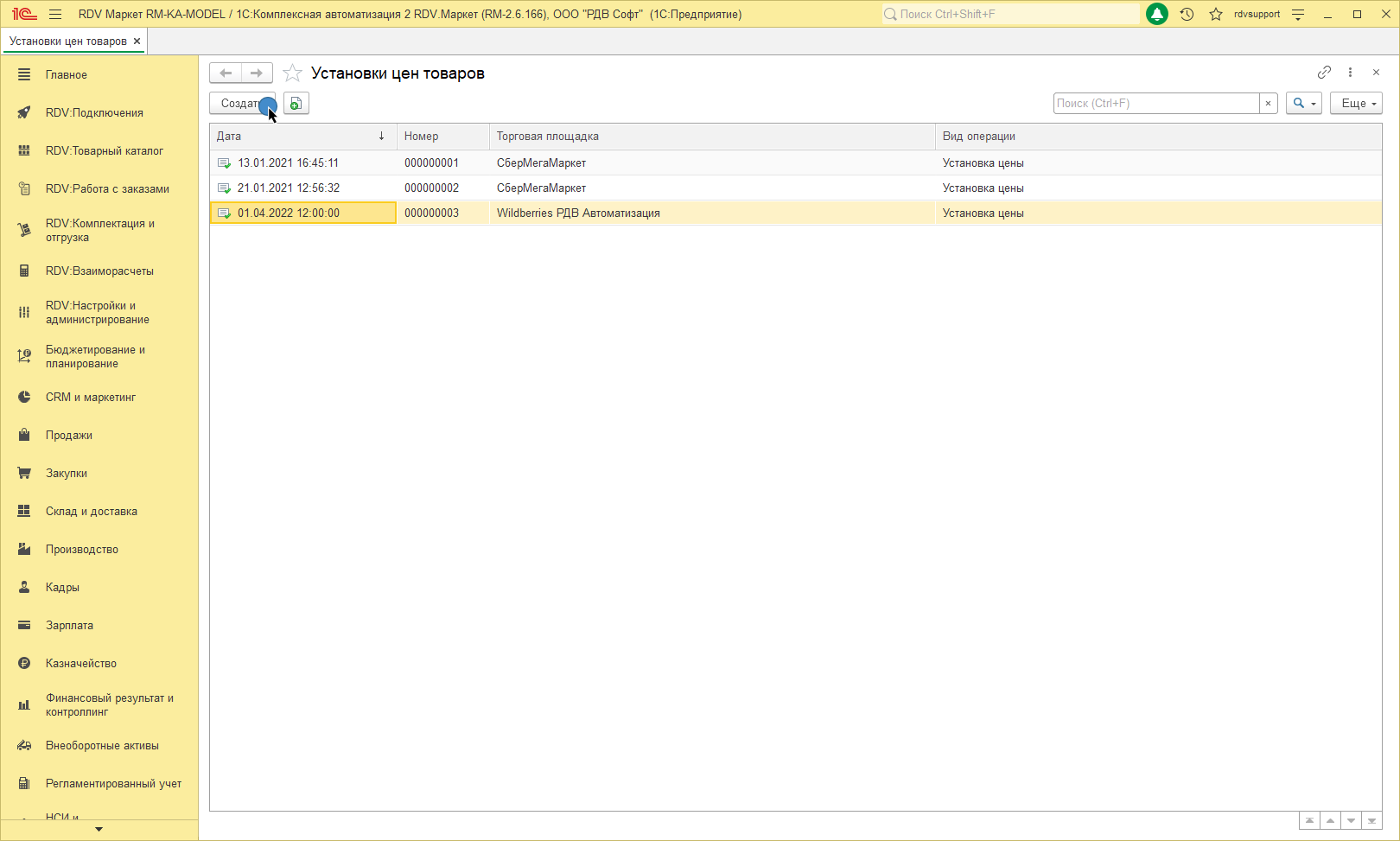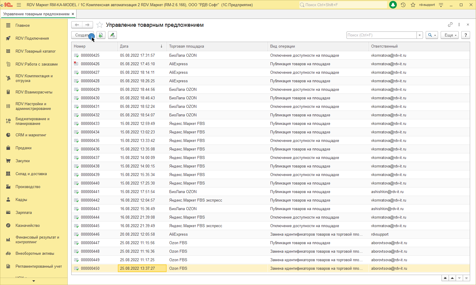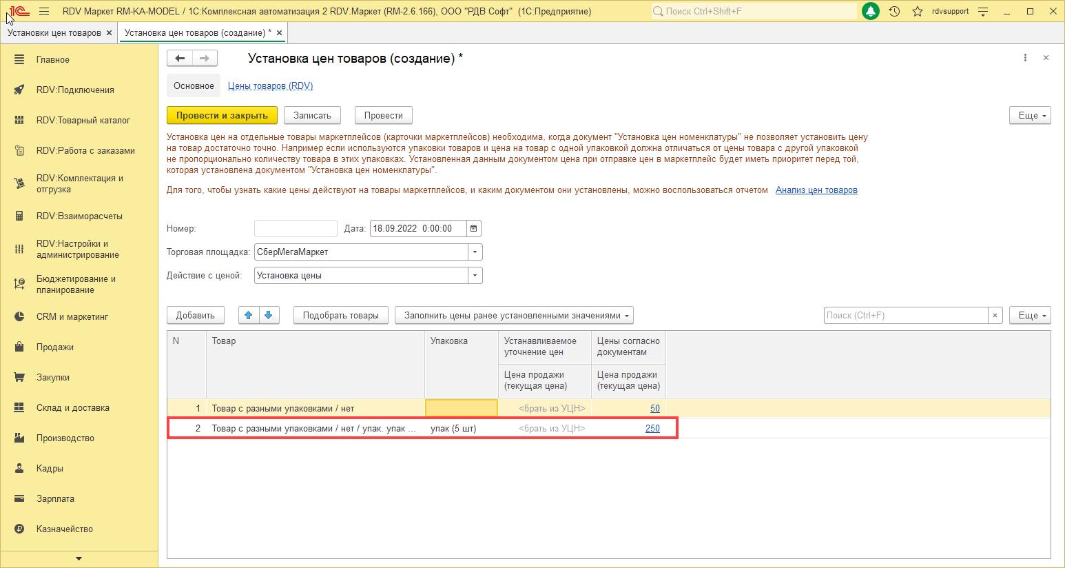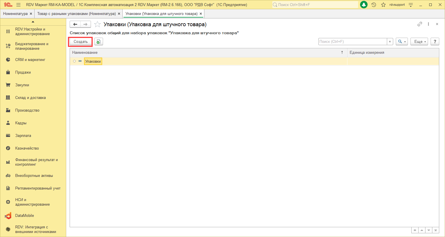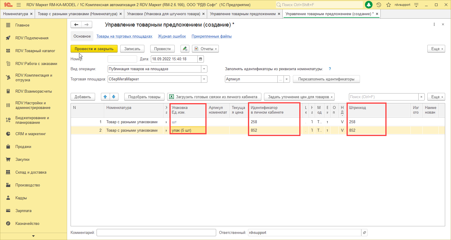 Для того, чтобы связать номенклатуру с учетом упаковки и товар маркетплейса, необходимо перейти в раздел RDV: Товарный каталог - Управление товарным предложением и нажать на кнопку Создать