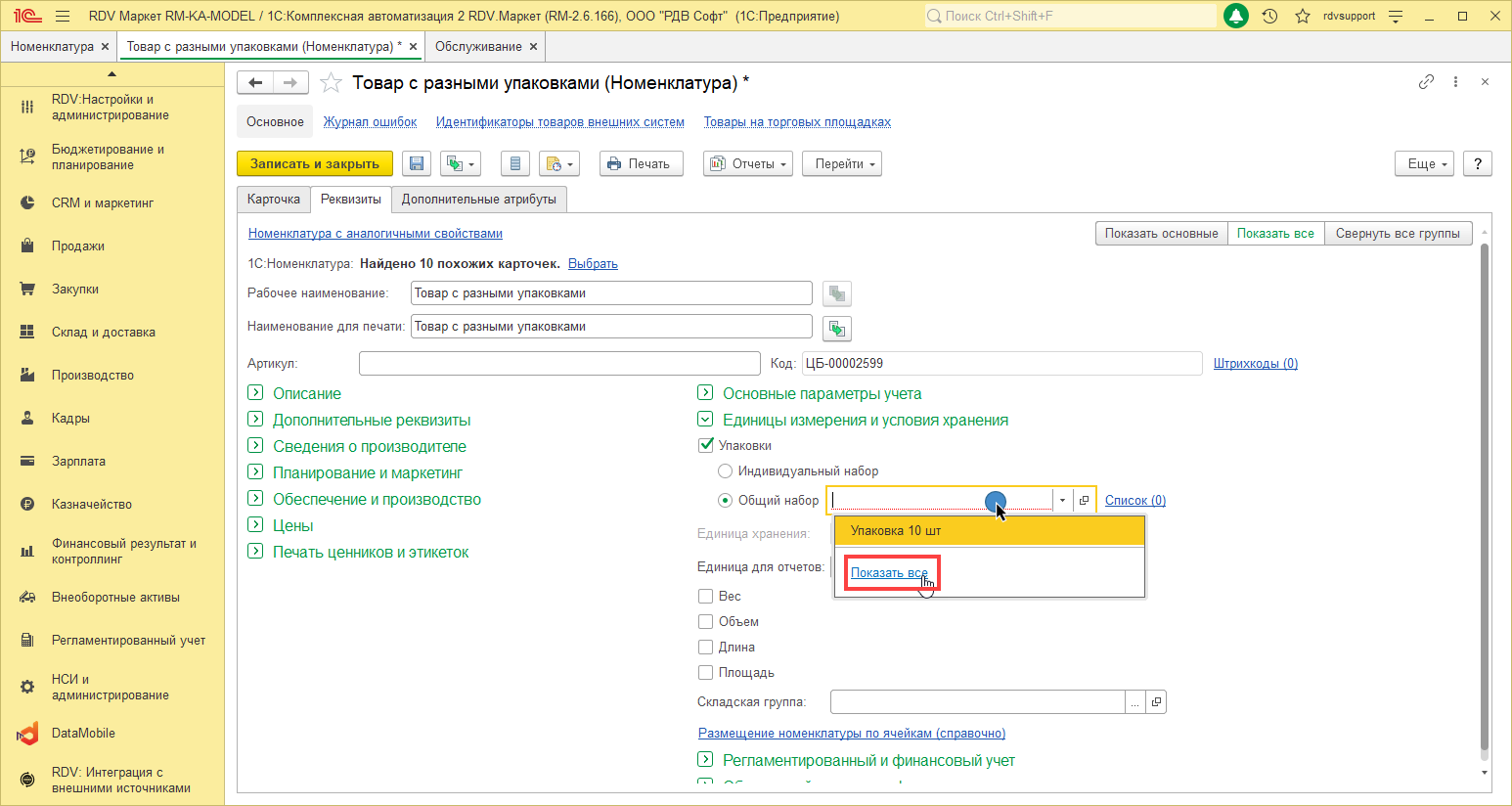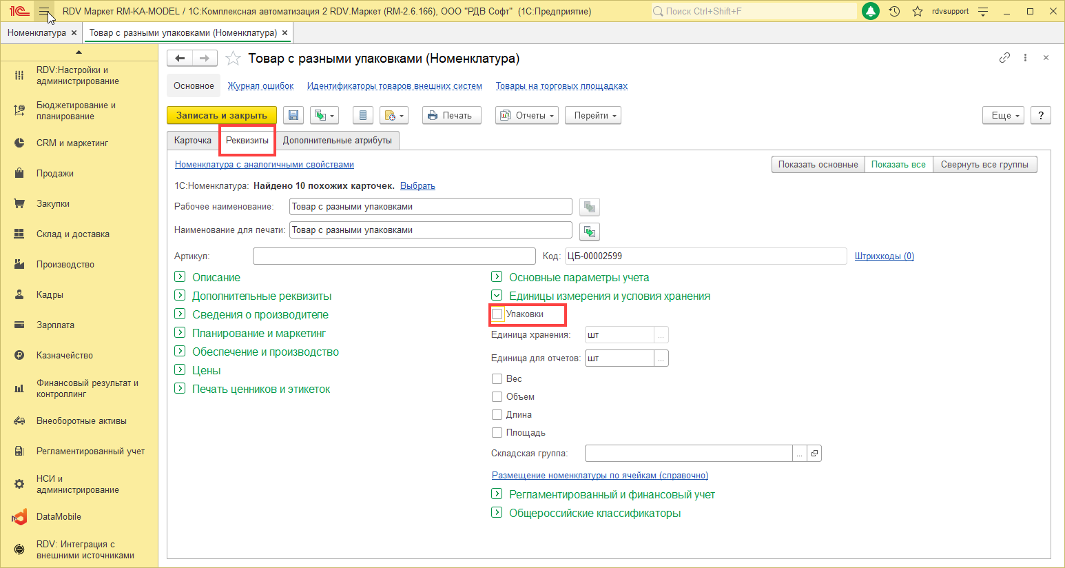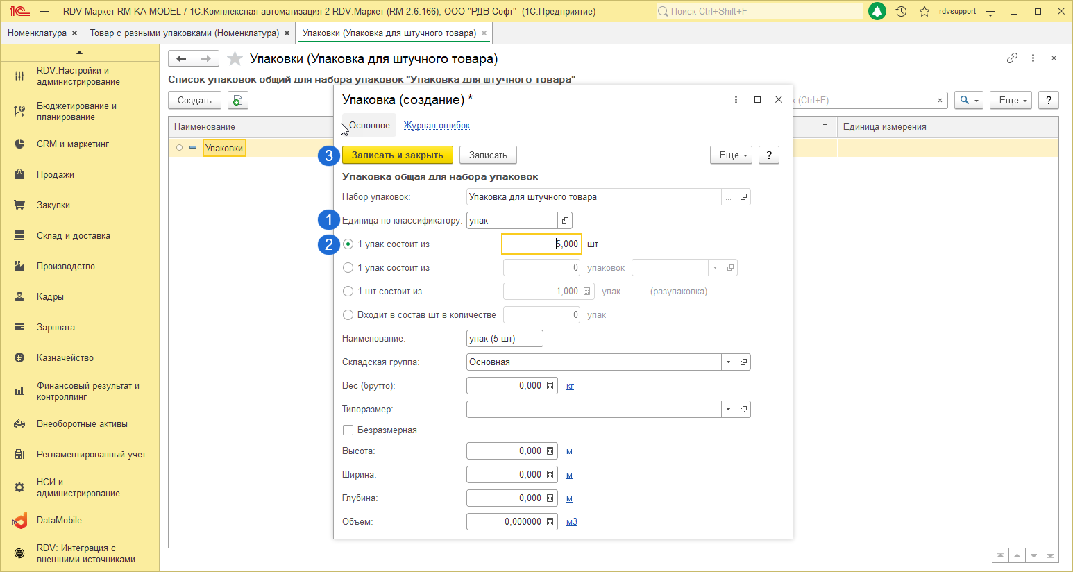 - Установить соответствие единицы измерения упаковки и единицы измерения номенклатуры