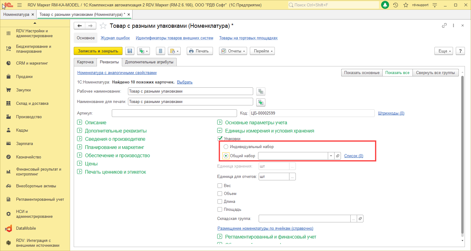 Если выбран Индивидуальный, то упаковки из данного набора можно указать только к одной номенклатуре. При выборе Общего набора можно создать или выбрать варианты упаковки для множества номенклатур.