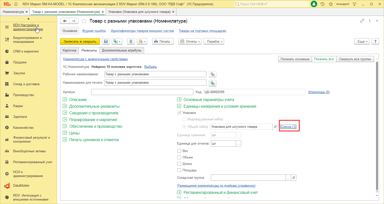 Для номенклатуры создана упаковка. Количество настроенных упаковок можно увидеть в скобках ссылки Список