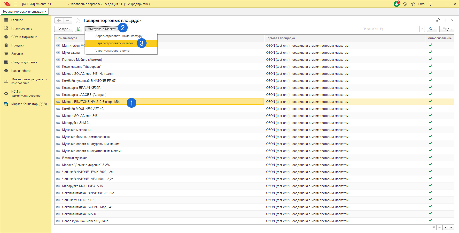 Для этого необходимо перейти в раздел "Маркет.Коннектор (РДВ)" регистр "Товары торговых площадок".