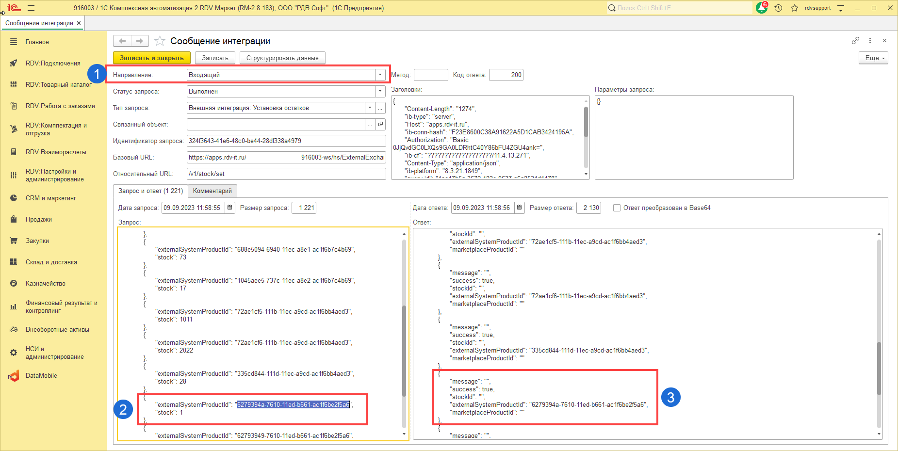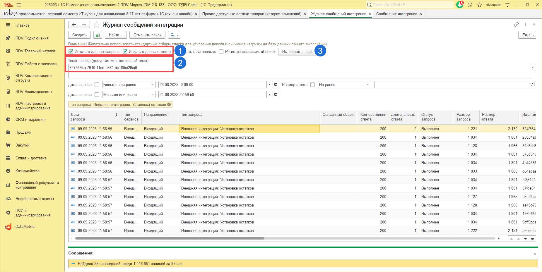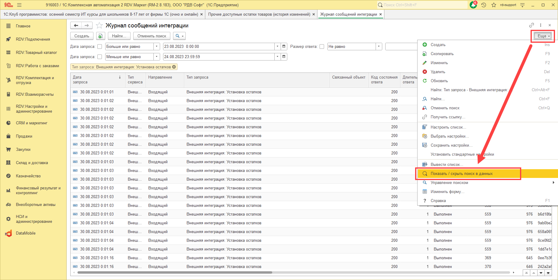 Для того чтобы проверить как выгрузился остаток необходимо в базе РДВ перейти в раздел "RDV:Настройки и администрирование" - "Журнал сообщений интеграции":