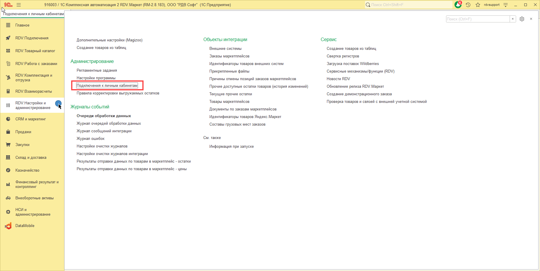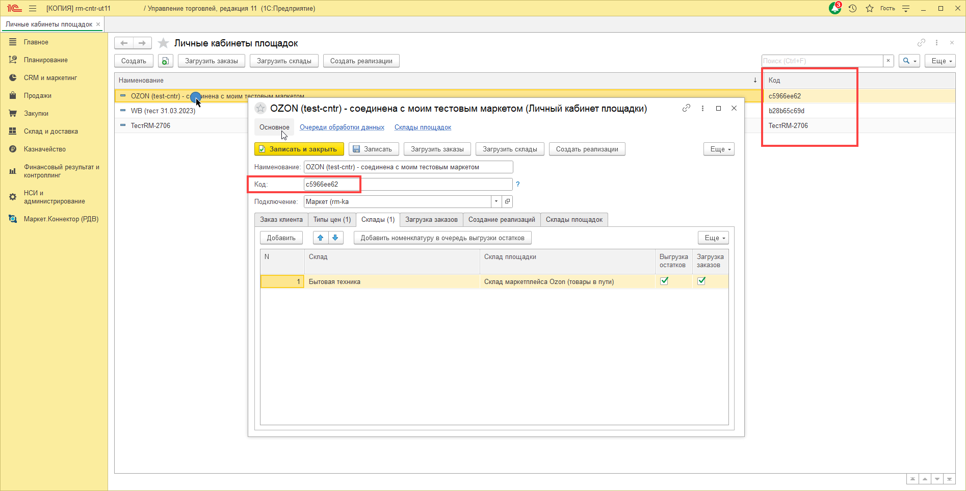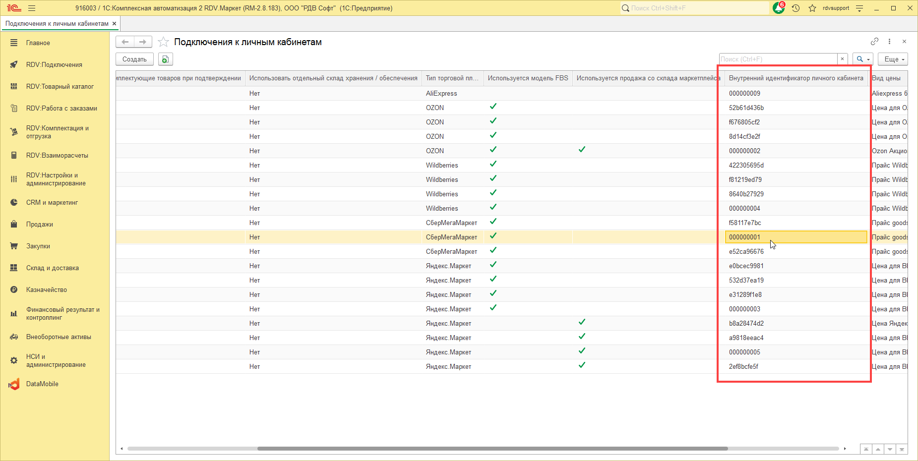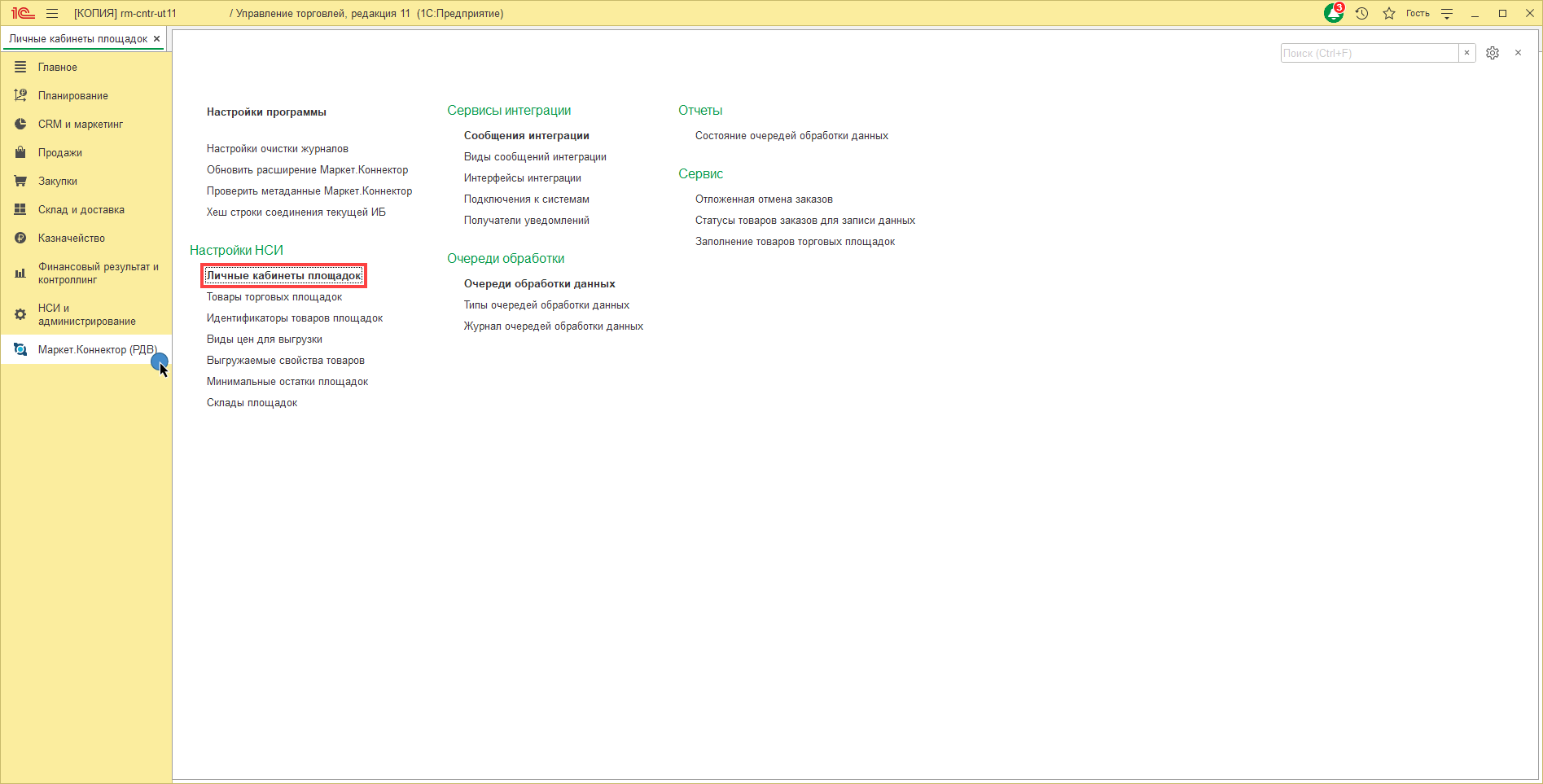 1. В разделе "Маркет.Коннектор (РДВ)" - "Личные кабинеты площадок" необходимо проверить склад с которого должны выгружаться остатки