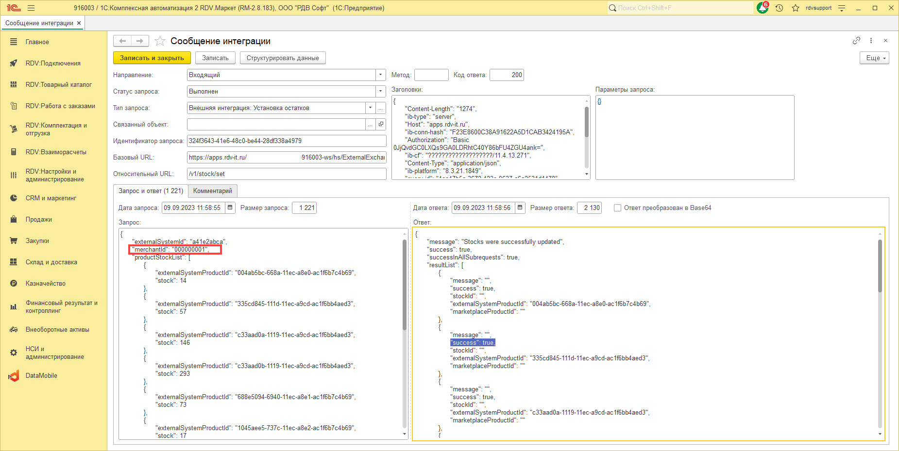 - База РДВ ответила, что остаток по данному товару принят т.к. получен ответ "success": true
