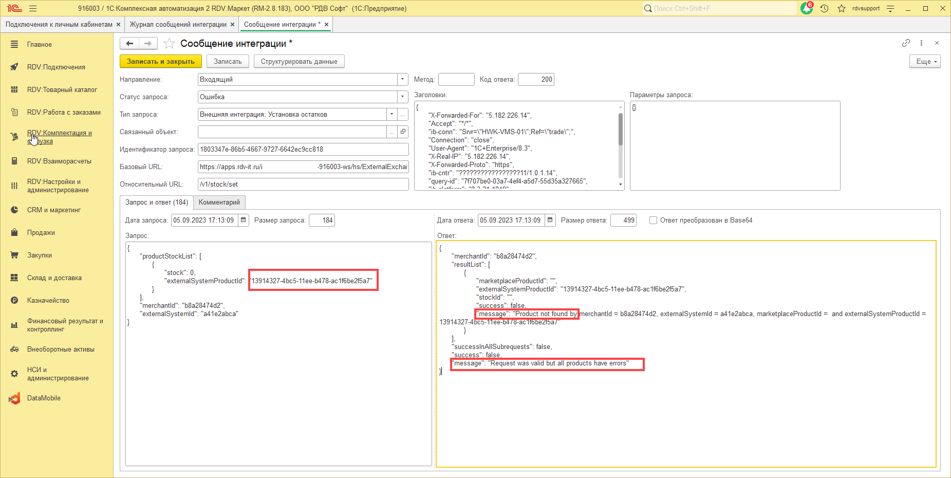 Ошибка "Product not found by" и "Request was valid but all products have errors" при передаче остатка