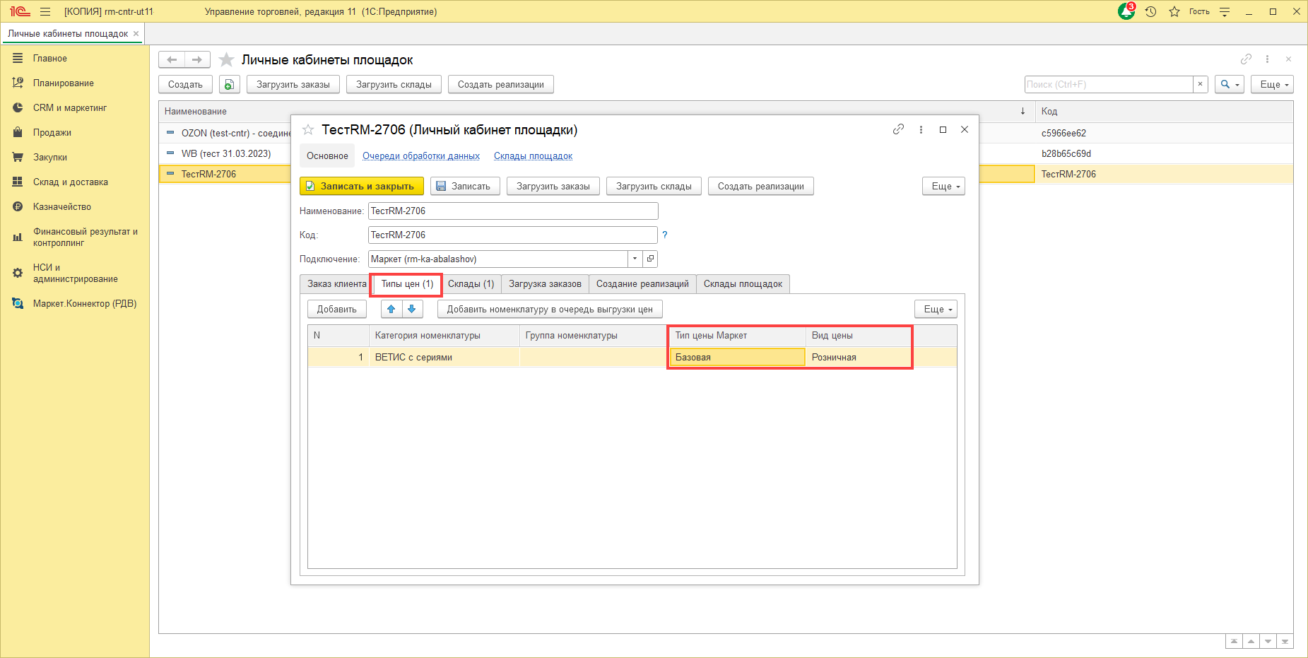 1. В разделе "Маркет.Коннектор (РДВ)" - "Личные кабинеты площадок" необходимо проверить соответствие видов цен в Маркете (в базе РДВ) и вид цены (в вашей базе):