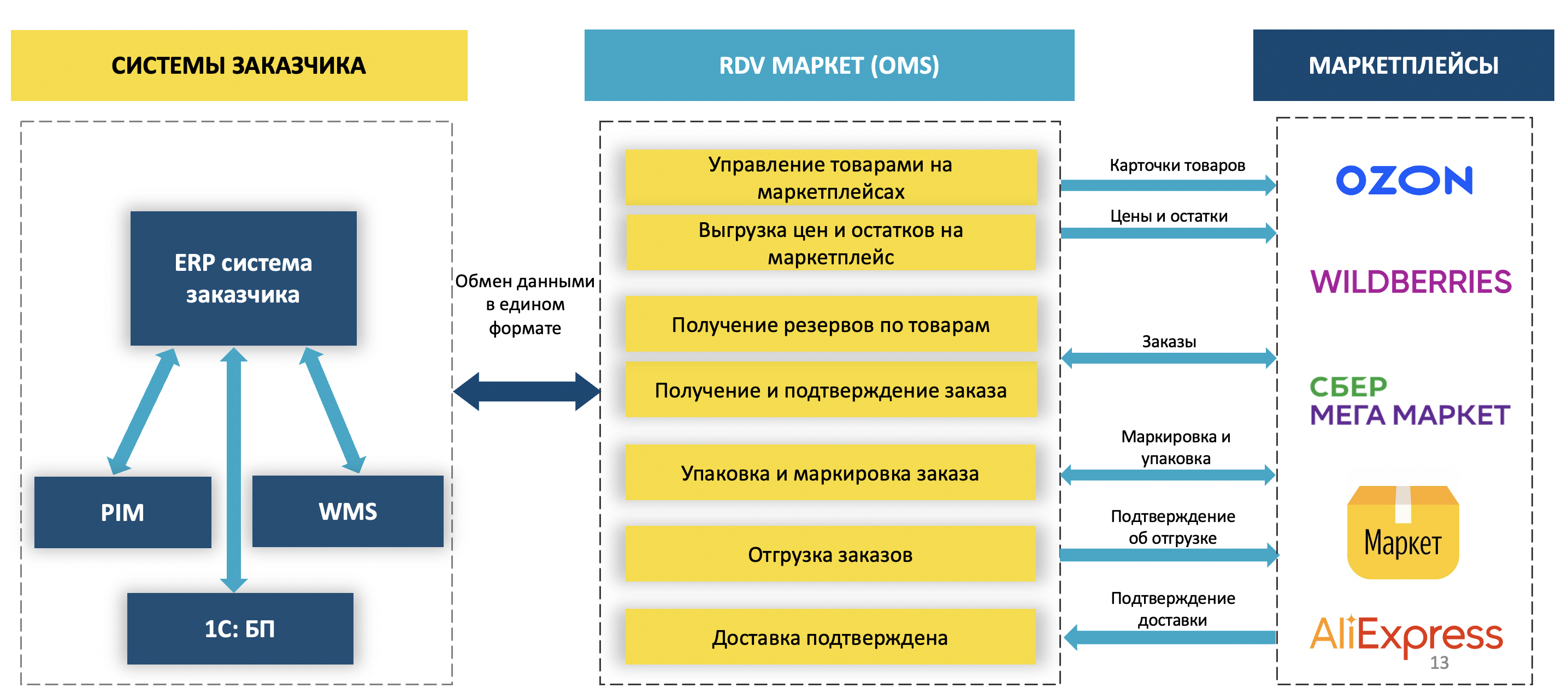 Пункты 2, 4 общего процесса обработки заказов необязательны для реализации со стороны Учетной системы, рекомендуем использовать штатные средства RDV Маркет для управления товарным каталогом, установкой цен.