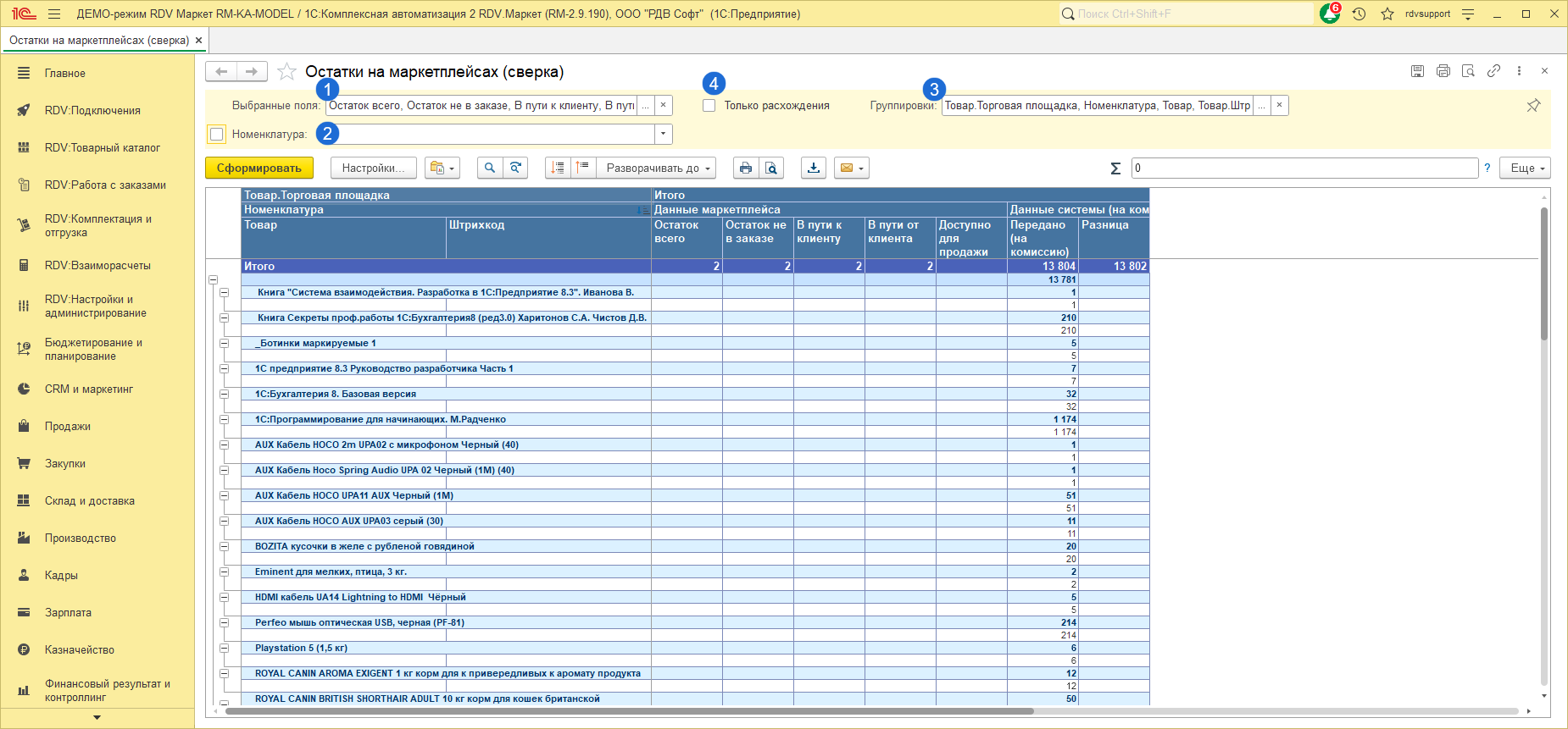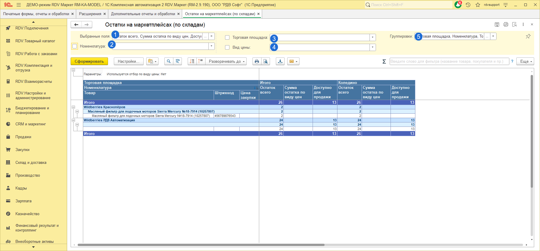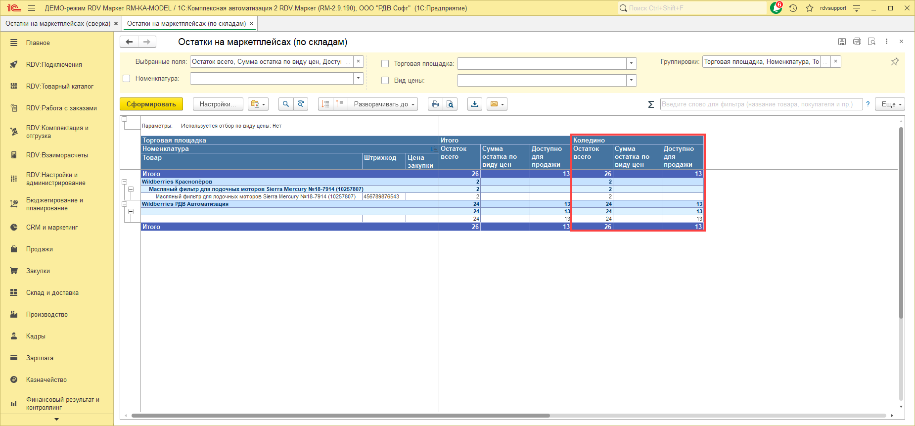 Отчеты находятся в разделе "RDV: Комплектация и отгрузка" - "Остатки на маркетплейсах (по складам)" / "Остатки на маркетплейсах (сверка)".