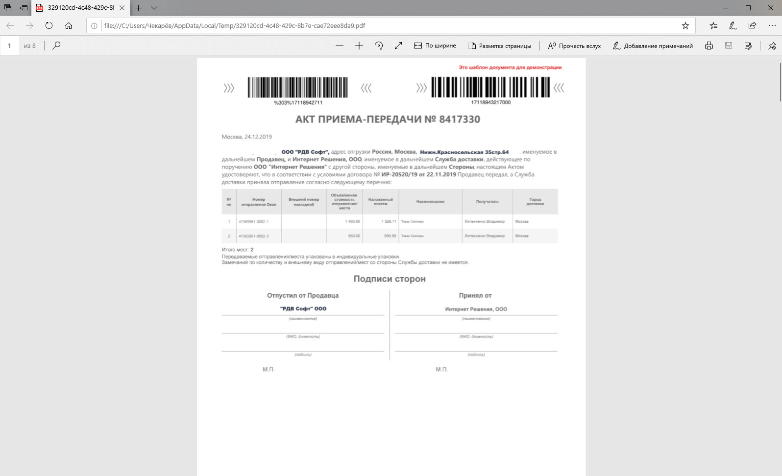 После запроса грузовых мест и документов от Озон, в акте приёма-передачи автоматически устанавливается подпись продавца, поэтому в 1С акт попадает уже подписанным.