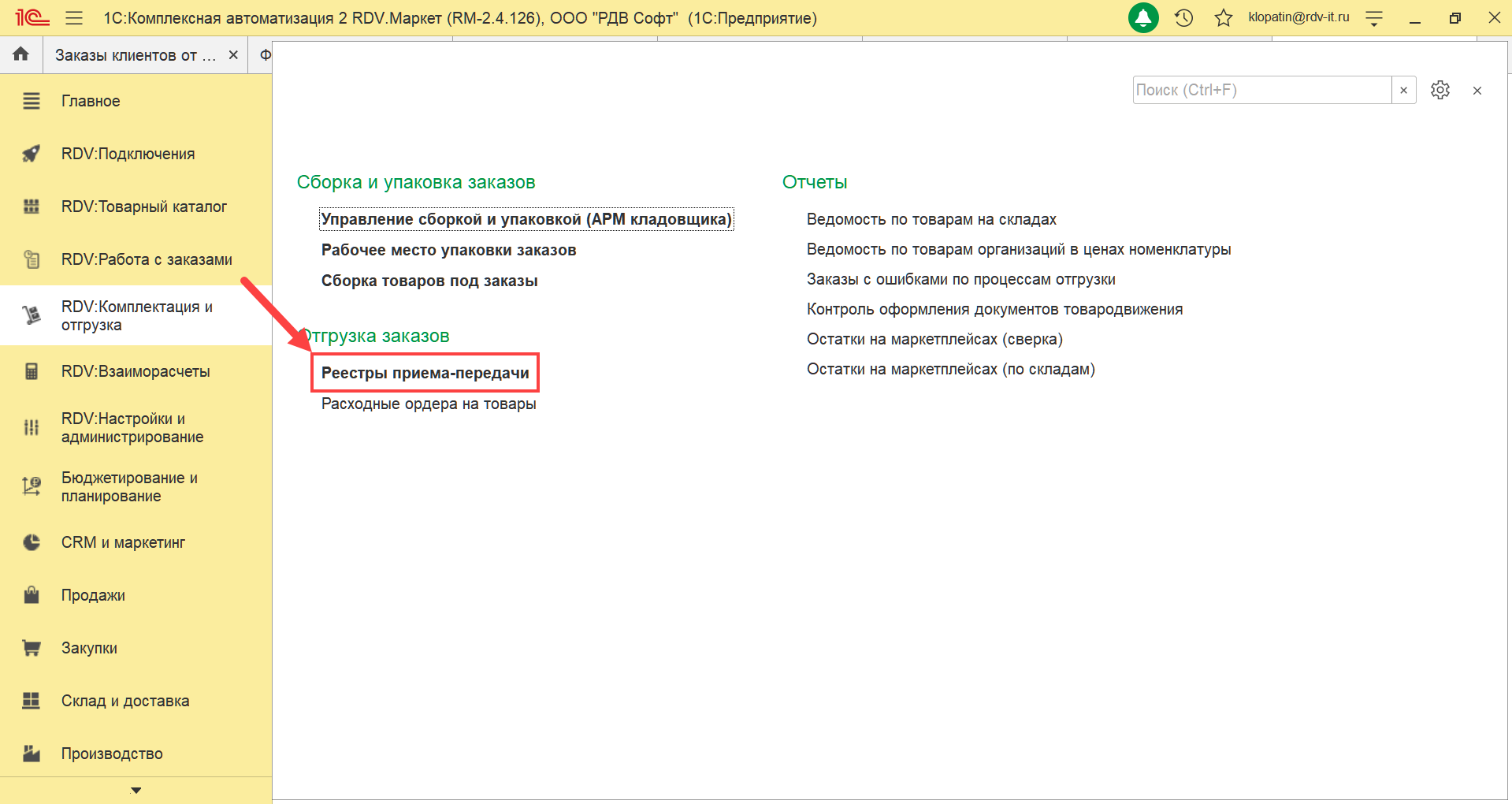 Так же, в меню "Реестры приема-передачи" вы можете перейти из интерфейса "Комплектация и отгрузка"