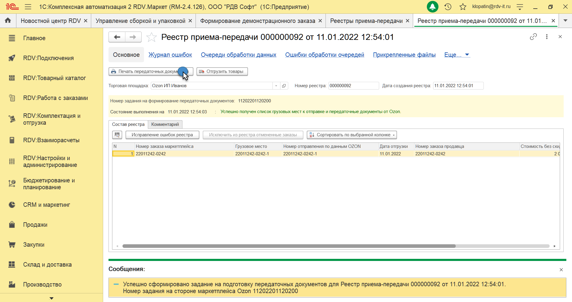 В табличную часть документа "Реестр приема-передачи" попадут сформированные в Ozon отгрузочные места. Для печати документов нажмите на кнопку "Печать передаточных документов".