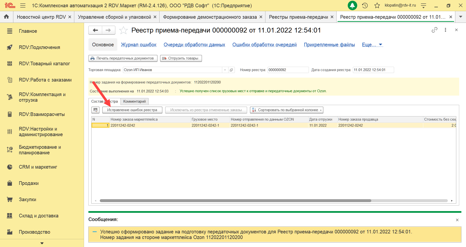 Если у вас произошел перенос заказа и отгрузка будет произведена более поздней датой, вы можете удалить расходный ордер из старого реестра приема-передачи, нажав на кнопку "Исправление ошибок реестра".