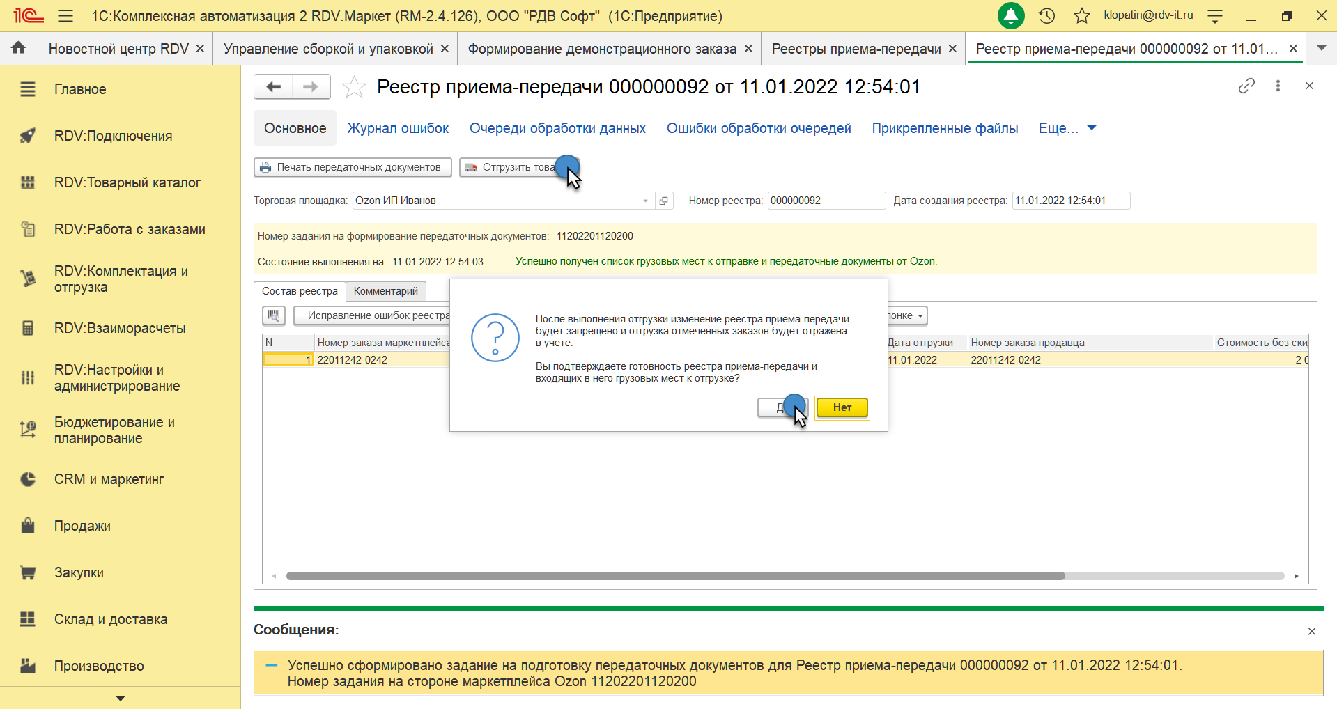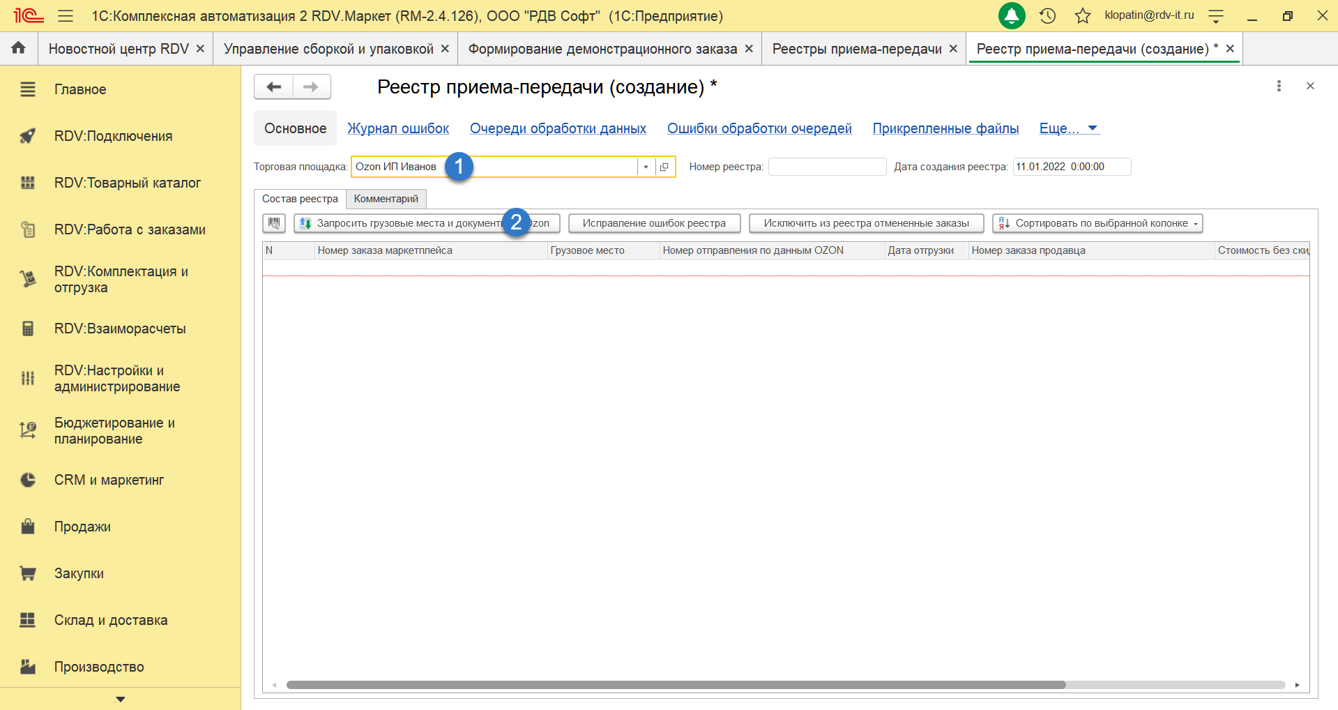 После того, как вы все товары упакованы - можно приступить к отгрузке. Для этого необходимо через рабочее место "Управление сборкой и упаковкой" открыть "Реестры приема-передачи":