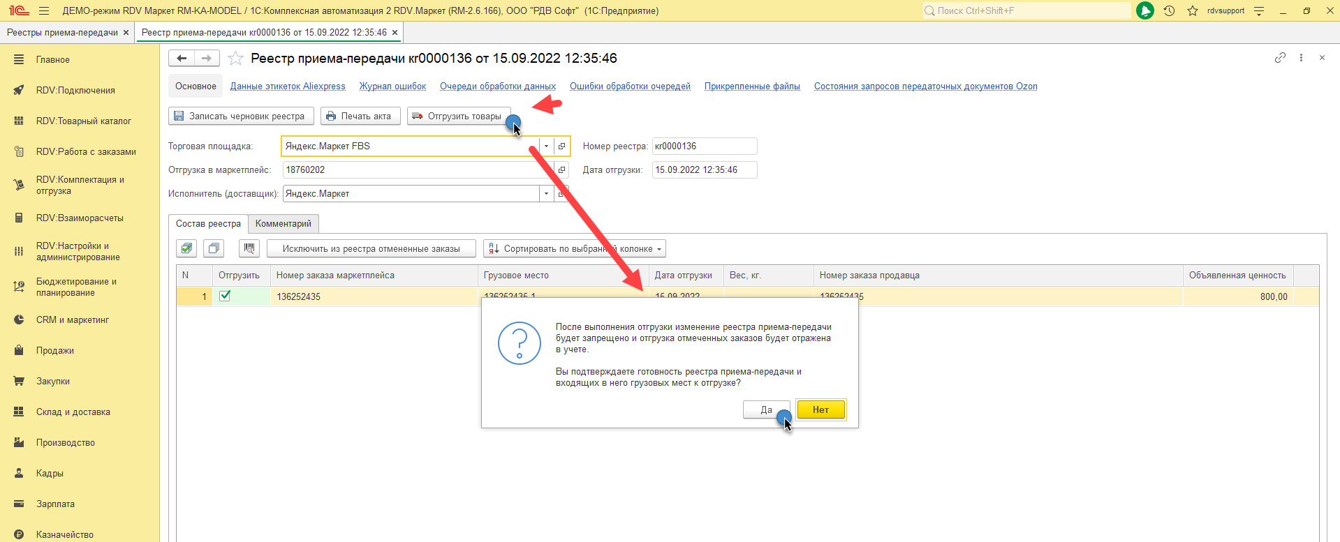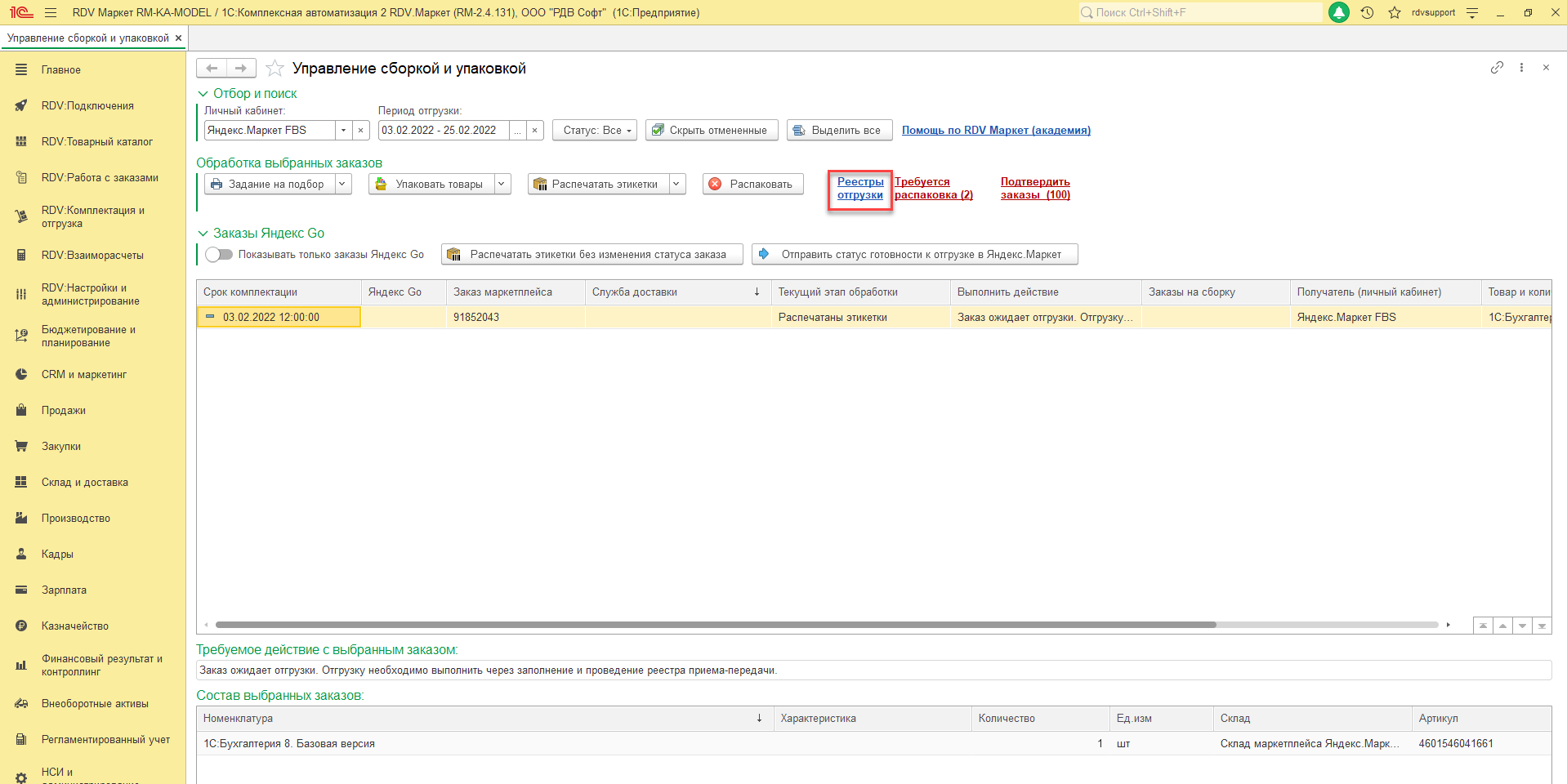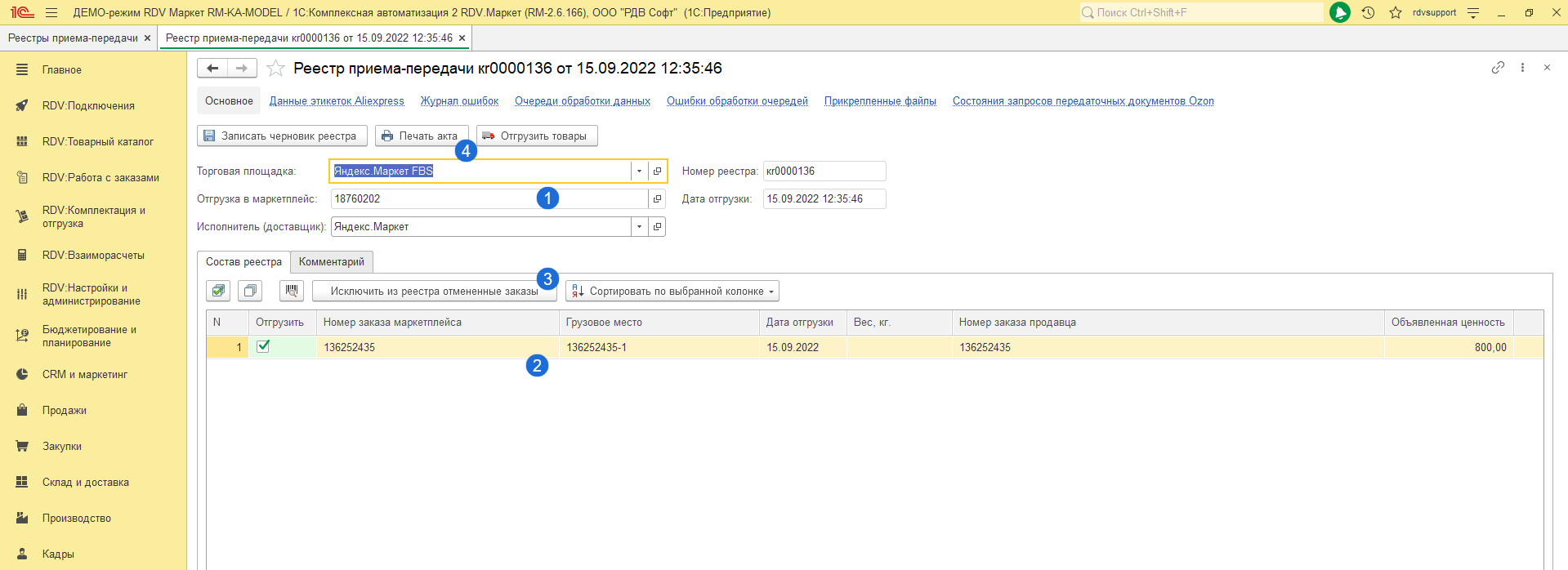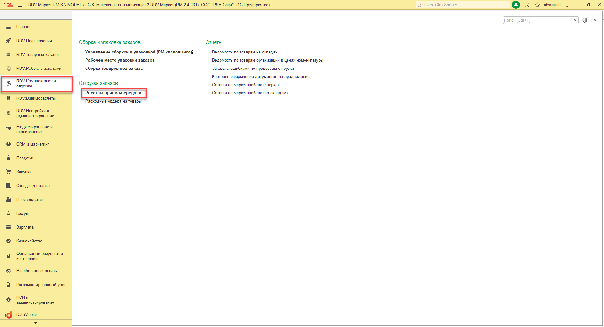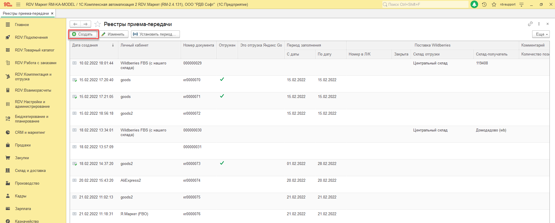 После того, как упакованы все товары, можно приступить к отгрузке. Для этого необходимо сформировать "Реестр приема-передачи". Список реестров доступен как из формы Управление сборкой и упаковкой, так и в меню RDV Комплектация и отгрузка