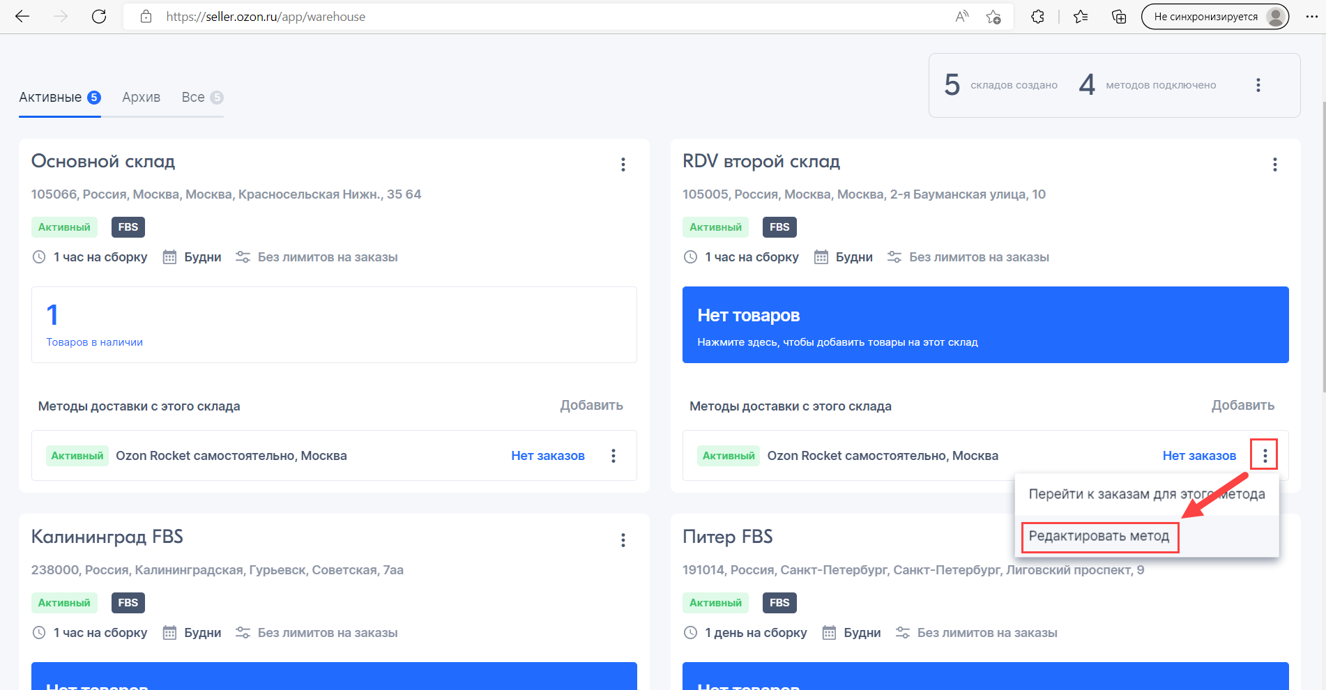 Далее в складах выбрать пункт Редактировать метод