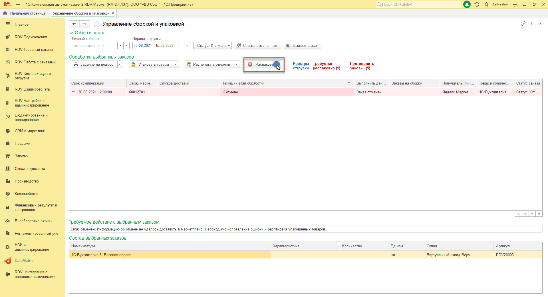 Чтобы распаковать отменённый заказ на этапе комплектации (т.е. до отгрузки), необходимо в меню "Управление сборкой и упаковкой" нажать на "Требуется распаковка"