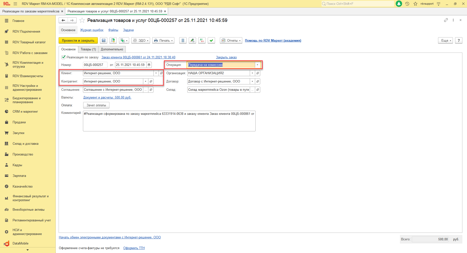 При оформлении реализации товаров в системах 1С компания RDV рекомендует использовать методологию учета "Товары в пути" с открытой датой перехода права собственности. Необходимо учитывать, что реализации товаров оформляются не датой отгрузки (передачи товаров курьерской службе), а датой фактического выкупа товаров Покупателем (физическим лицом). Информацию о дате фактической доставки можно получить с помощью отчетов из Личного кабинета продавца, или по API.