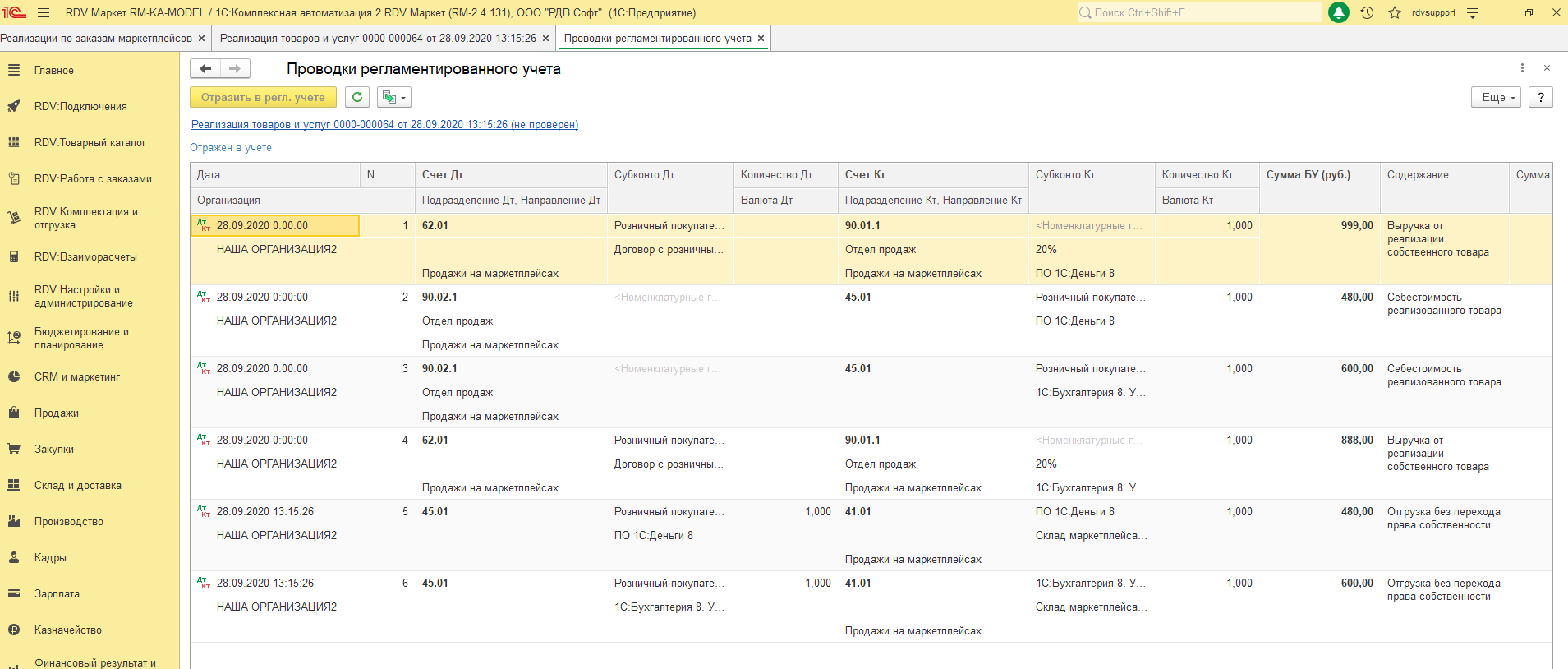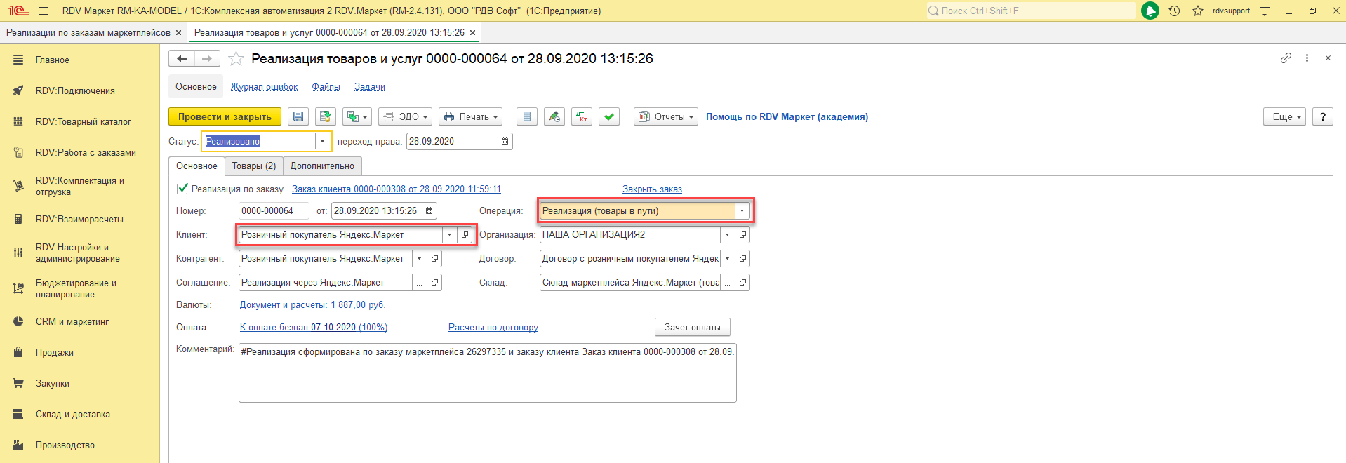 При оформлении реализации товаров в системах 1С компания RDV рекомендует использовать методологию учета с использованием перехода права собственности. Необходимо учитывать то, что реализации товаров оформляется не датой отгрузки (передачи товаров курьерской службе), а датой фактического выкупа товаров Покупателем (физическим лицом). Информацию по дате фактической доставки можно получить с помощью отчетов из личного кабинета продавца или по API.