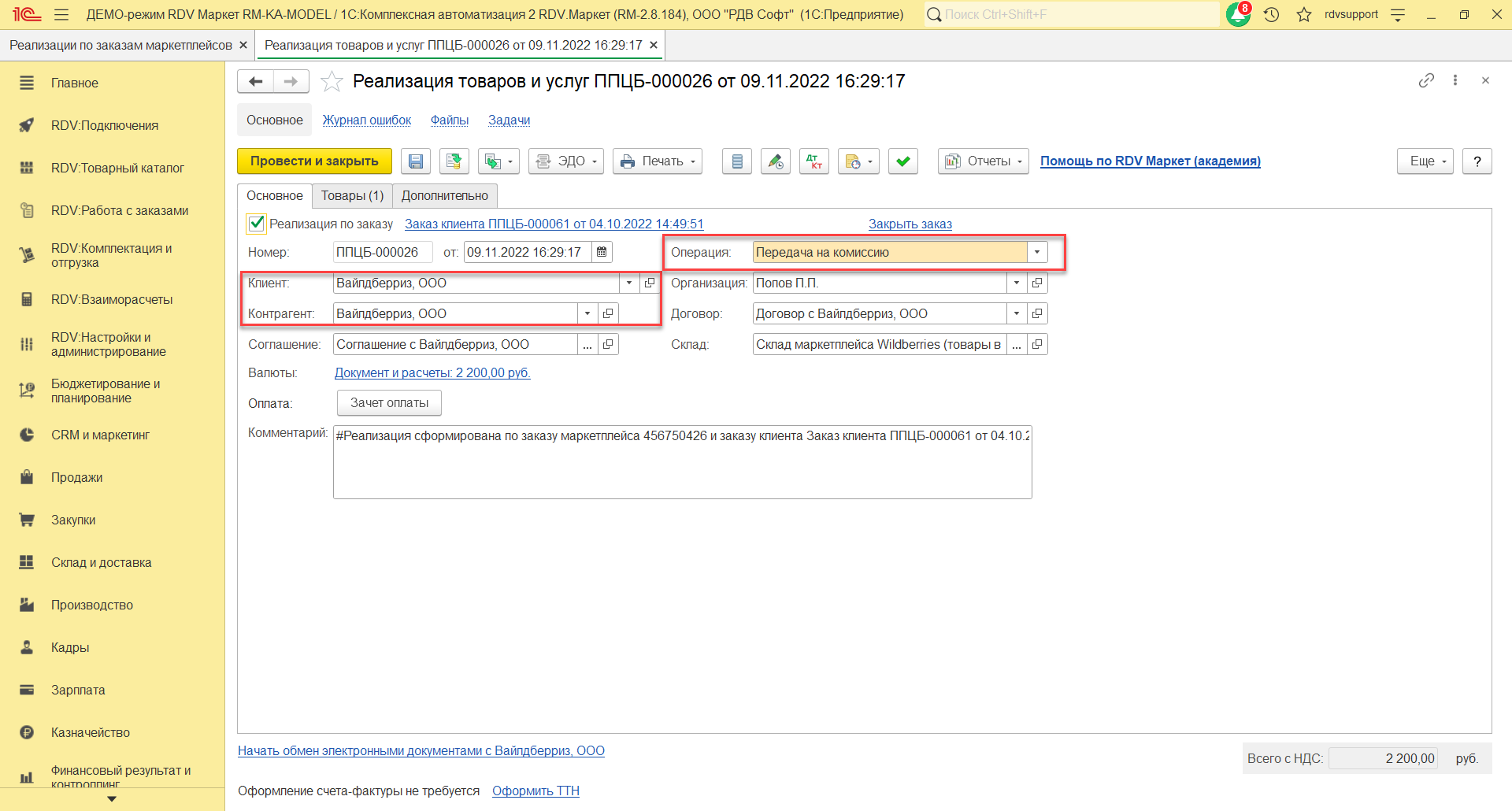 - После фактической доставки товаров покупателю Wildberries сообщает полную информацию о составе реализации товаров, об условиях участия в программе лояльности (скидках), и в системе на основании заказа клиента (от ООО «Вайлдберриз») формируется документ "Реализация товаров и услуг" с типом операции "Передача на комиссию".