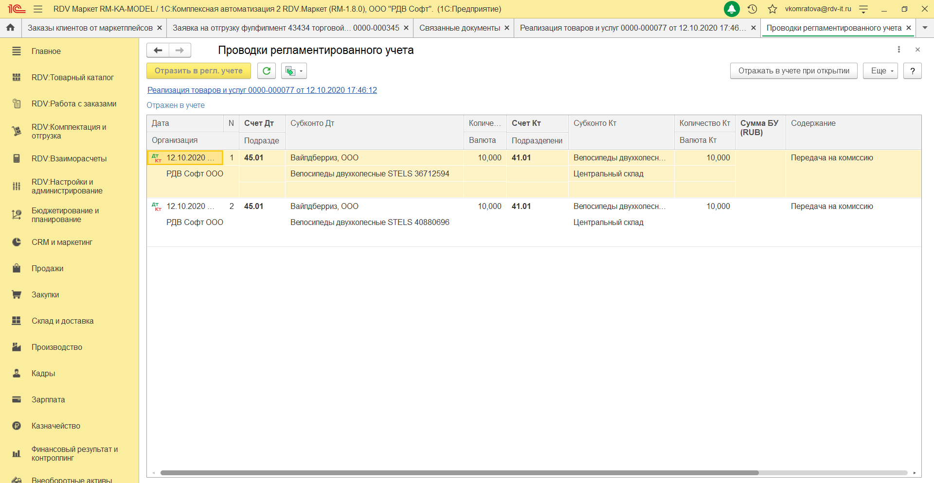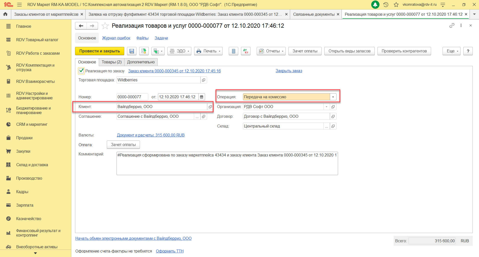 - В момент отгрузки товаров на поставку в Wildberries, автоматически формируется документ Реализация товаров и услуг с типом Передача на комиссию.
