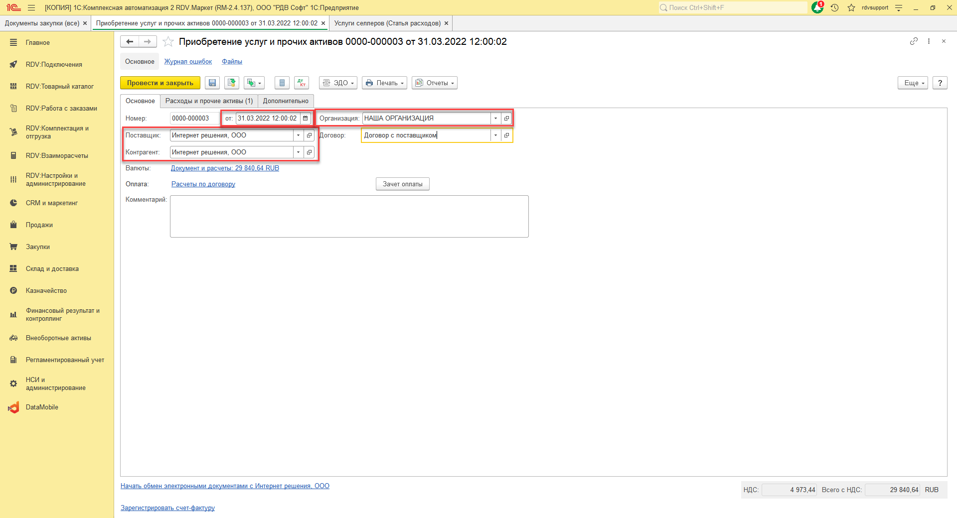 Во вкладке Основное необходимо ввести дату "от" – в соответствии с УПД, Поставщик = Контрагент = Интернет решения, ООО, указать (создать) договор при необходимости.