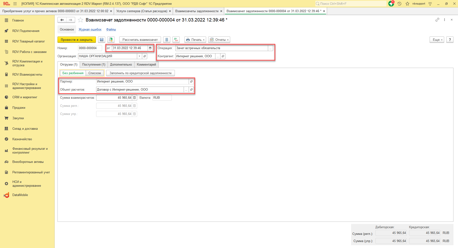 В документе Взаимозачет задолженности выбрать тип операции "Зачет встречных обязательств", Контрагент = Интернет решения, ООО, во вкладке Отгрузки указать Объект расчетов = Договор с комиссионером Ozon, во вкладке Поступления указать Объект расчетов (можно "Списком") = документ Приобретение услуг и прочих активов или Договор с поставщиком Ozon.