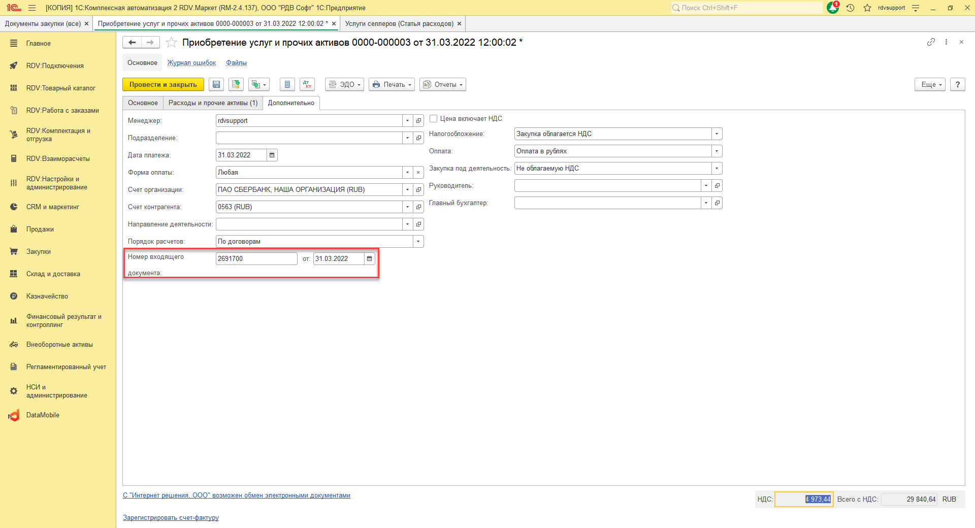 Во вкладке Дополнительно следует указать Номер и дату входящего документа (УПД из ЛК).
