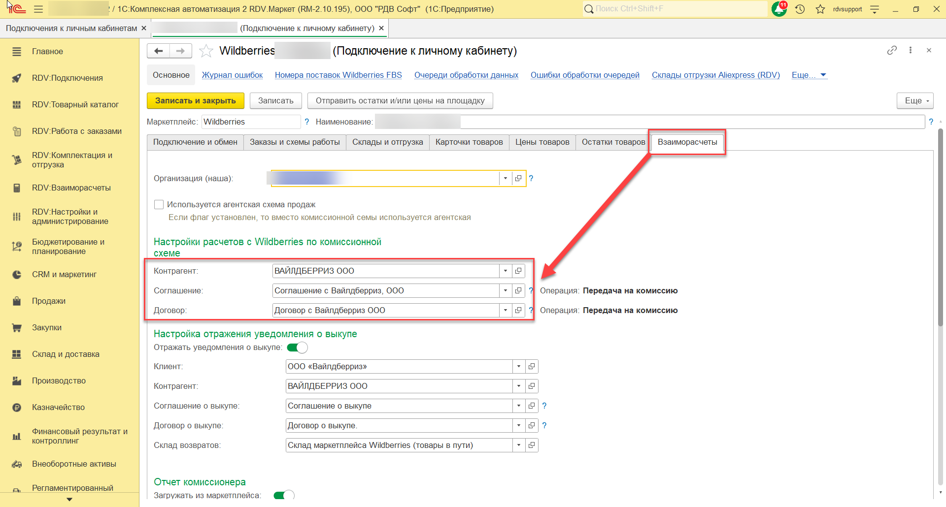 Создайте договор с новым юридическим лицом (ООО "РВБ") договор, соглашение в разделе "RDV: Подключения" - "Подключения к личным кабинетам "- вкладка "Взаиморасчеты":