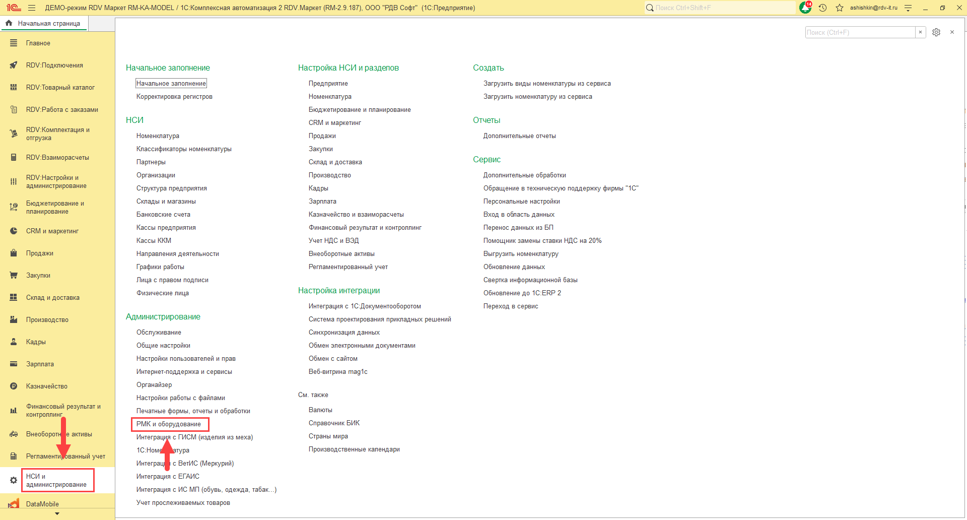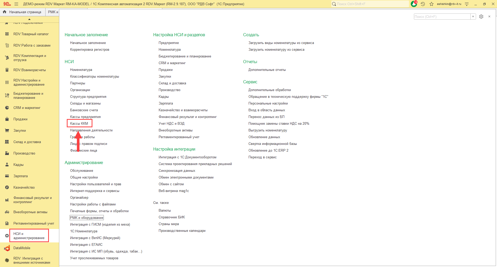 После установки драйвера ККТ необходимо перейти в раздел "НСИ и администрирование" - "РМК и оборудование".
