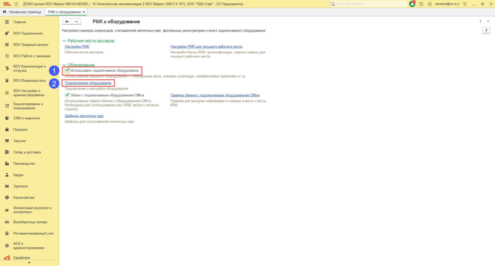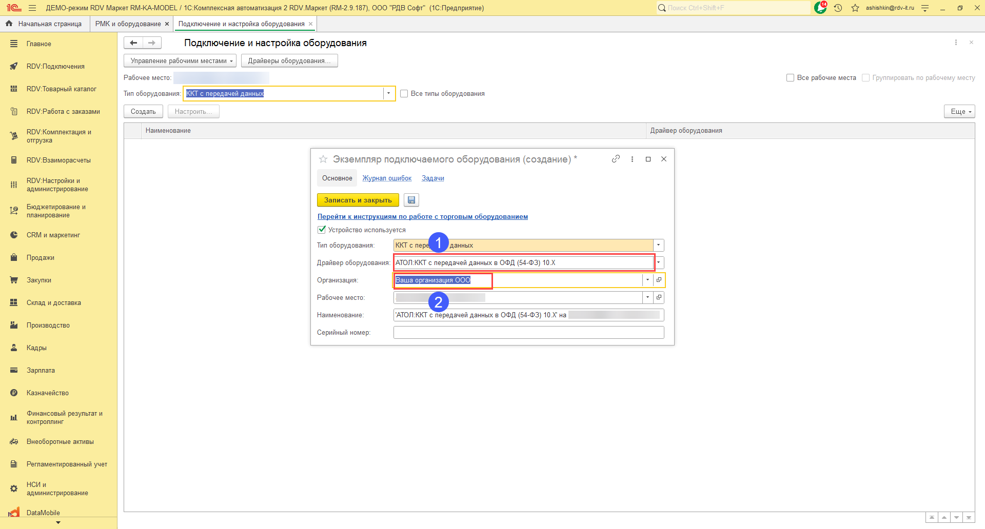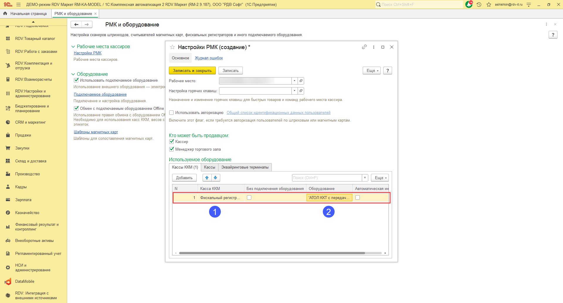 В окне настроек РМК необходимо выбрать ранее созданную кассу ККМ (1) и ранее созданное оборудование (2).