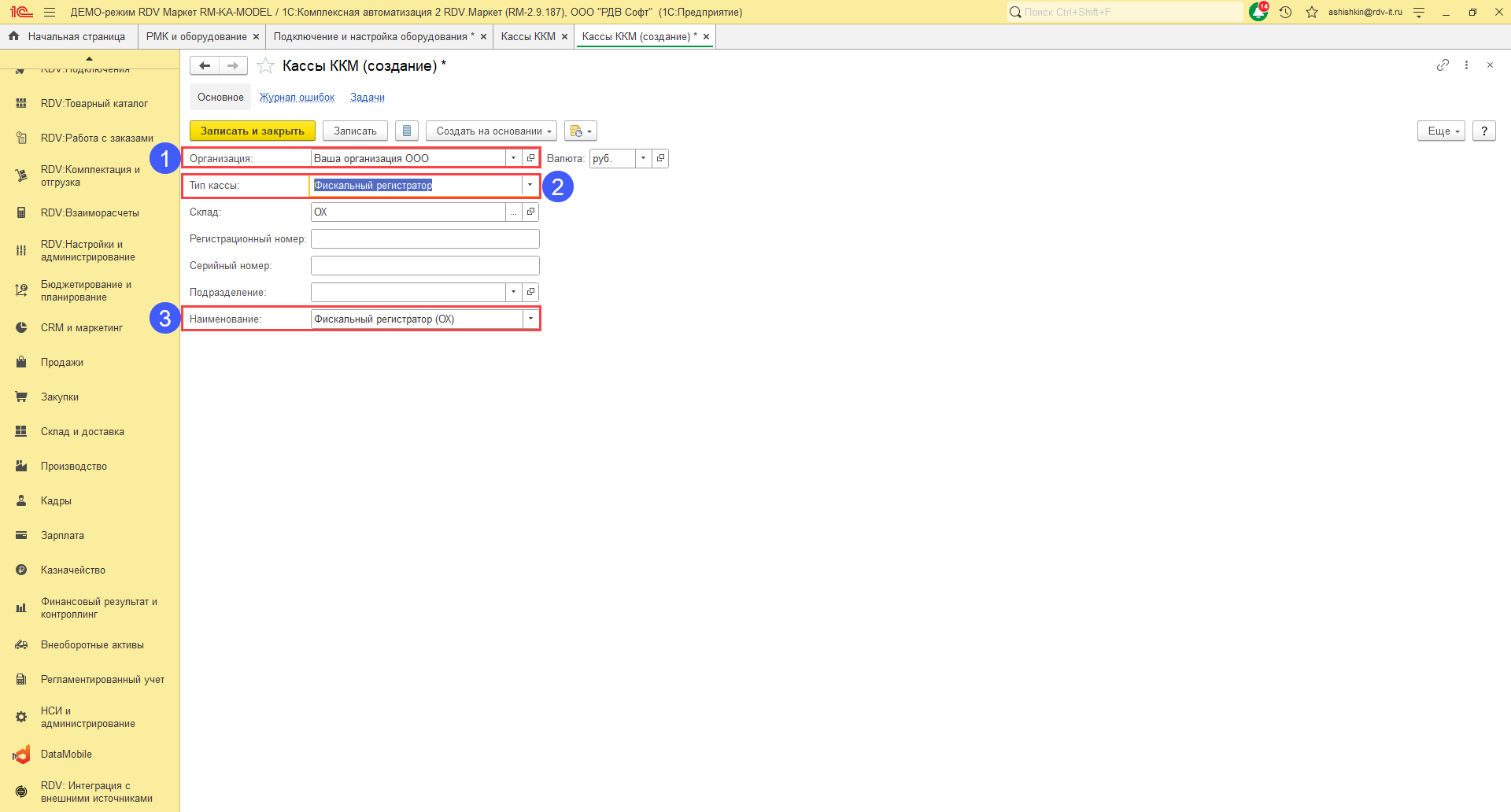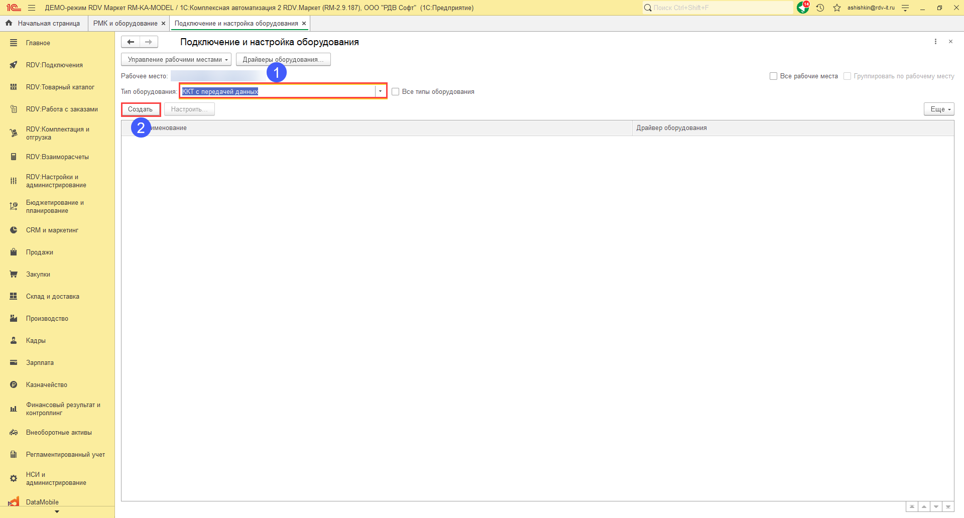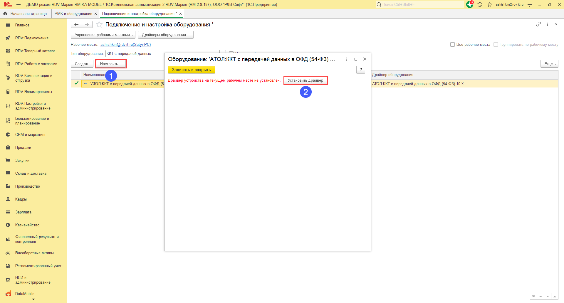 В окне настроек РМК необходимо выбрать ранее созданную кассу ККМ (1) и ранее созданное оборудование (2).