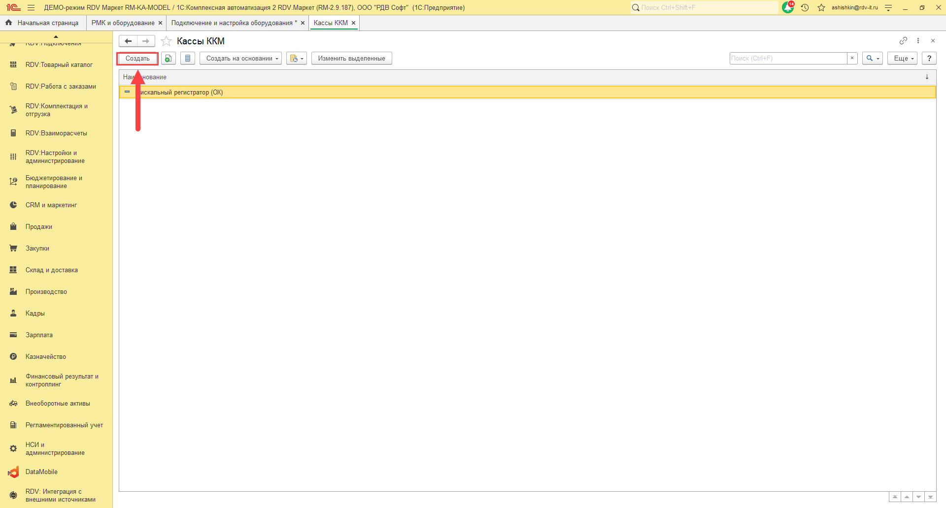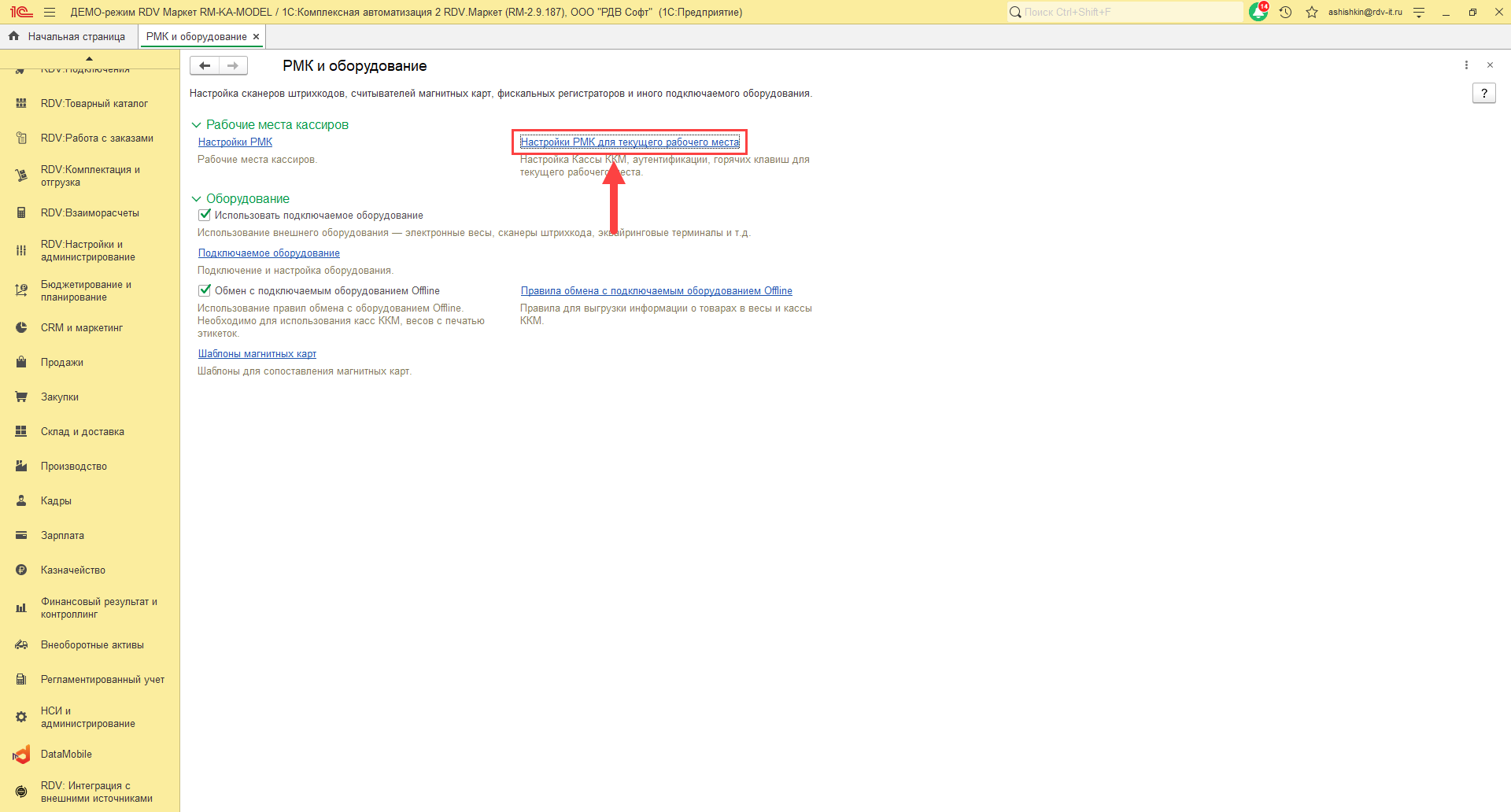 После создания кассы ККМ, в разделе "РМК и оборудование" необходимо перейти в меню "Настройки РМК для текущего рабочего места".