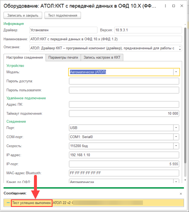 После установки драйвера ККТ (компонента 1С), нажмите на кнопку "Тест подключения", что бы проверить связь ККТ и 1С.
