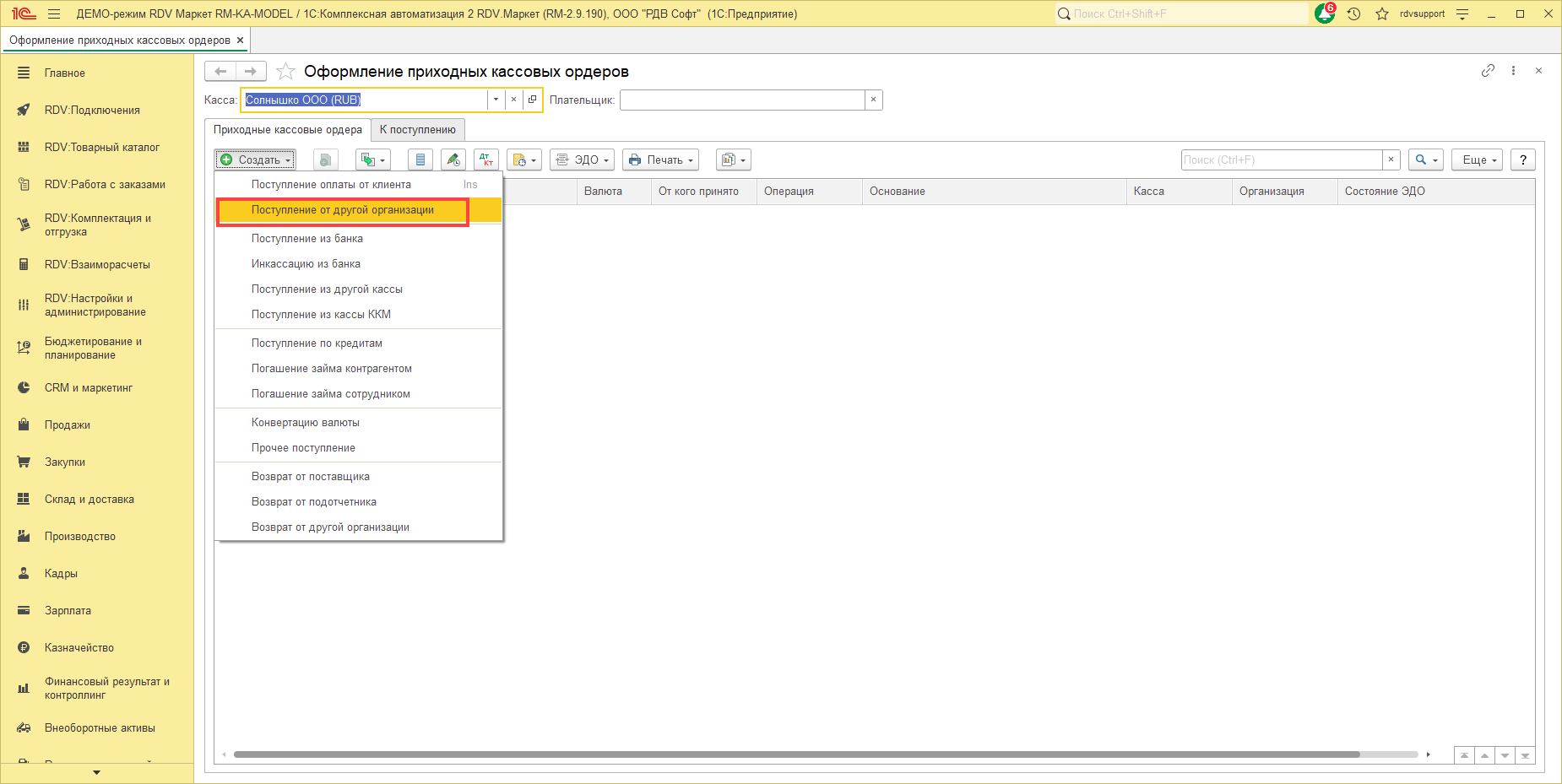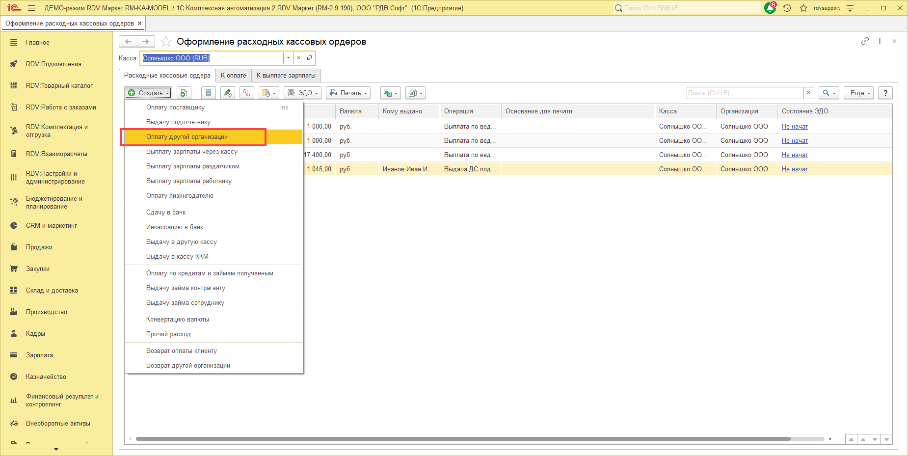 Для оформления денежных расчетов между своими организациями в кассовых документах есть соответствующие операции: "Оплата другой организации" в документе "Расходный кассовый ордер" и "Поступление от другой организации" в документе "Приходный кассовый ордер".