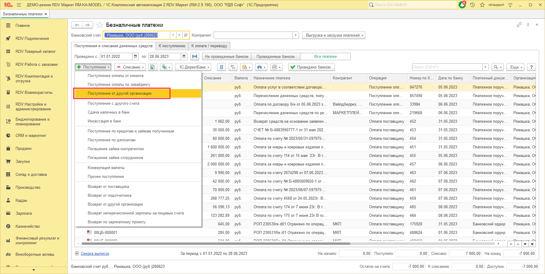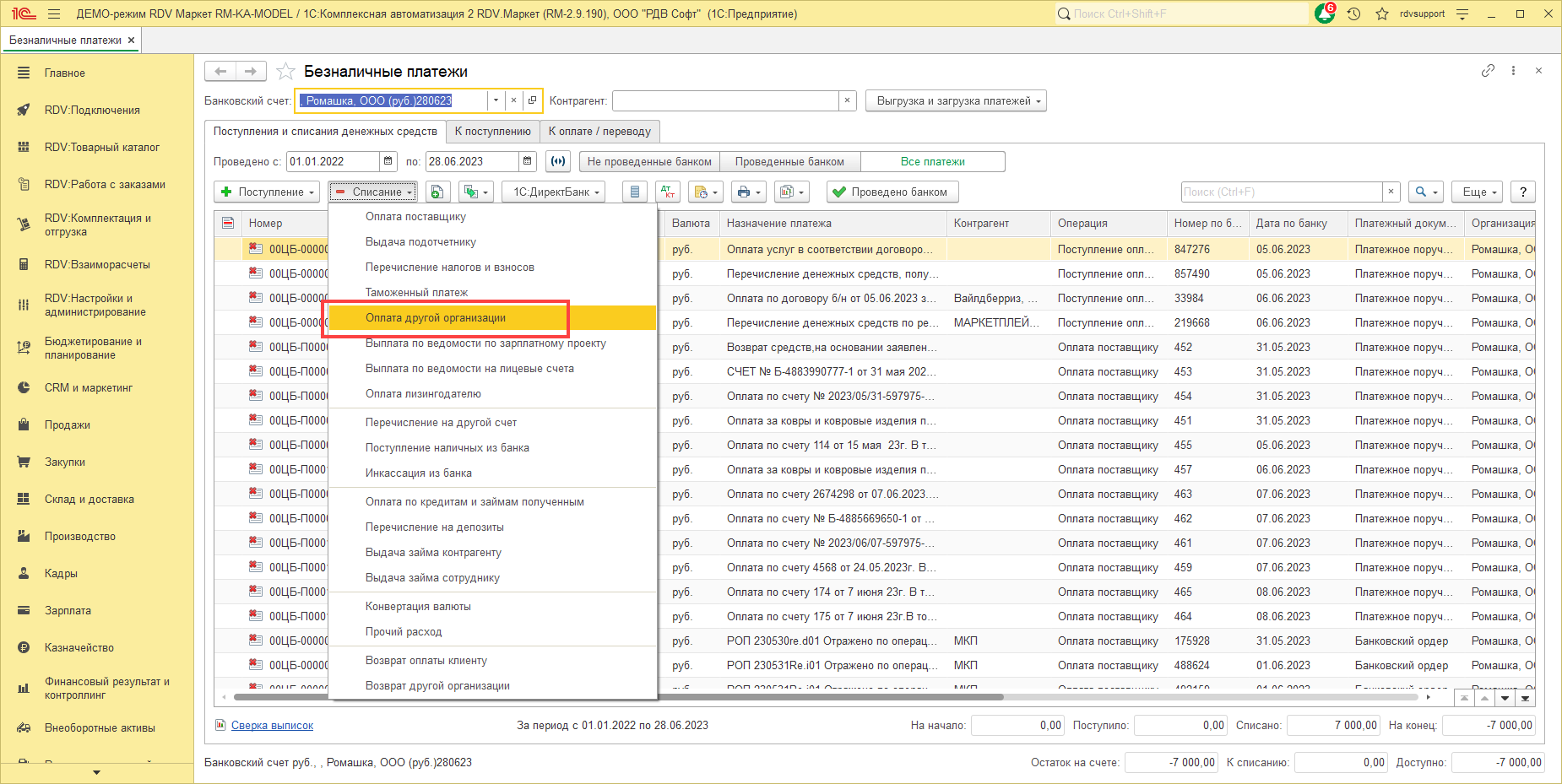 Для отражения безналичных расчетов используется документ "Списание безналичных денежных средств" с видом операции "Оплата в другую организацию":