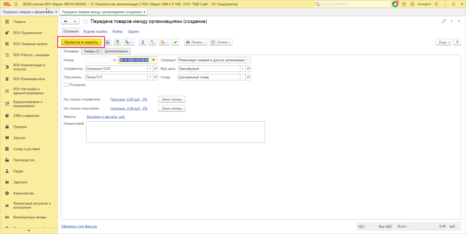 В сформированном документе необходимо проверить товары, количество и цены, после чего нажать "Провести и закрыть":