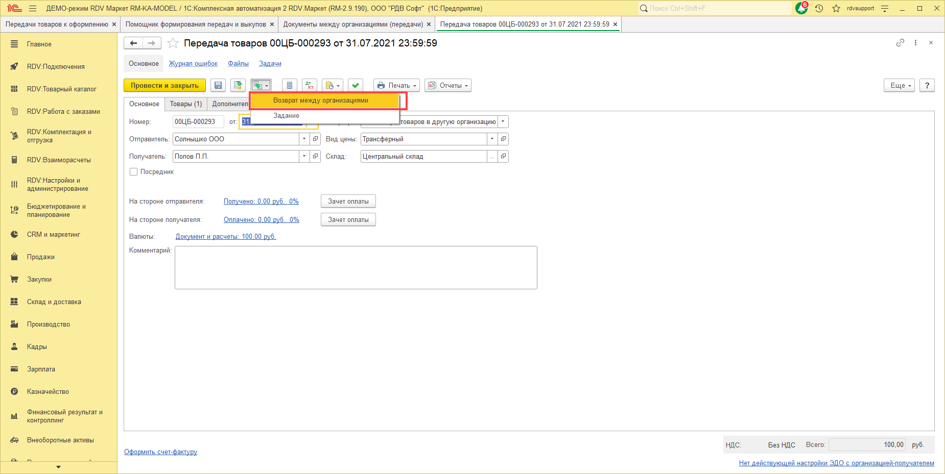 Если клиент вернул товар, ранее проданный по схеме "Интеркампани", то возврат между организациями можно создать из документа "Передача товаров между организациями":