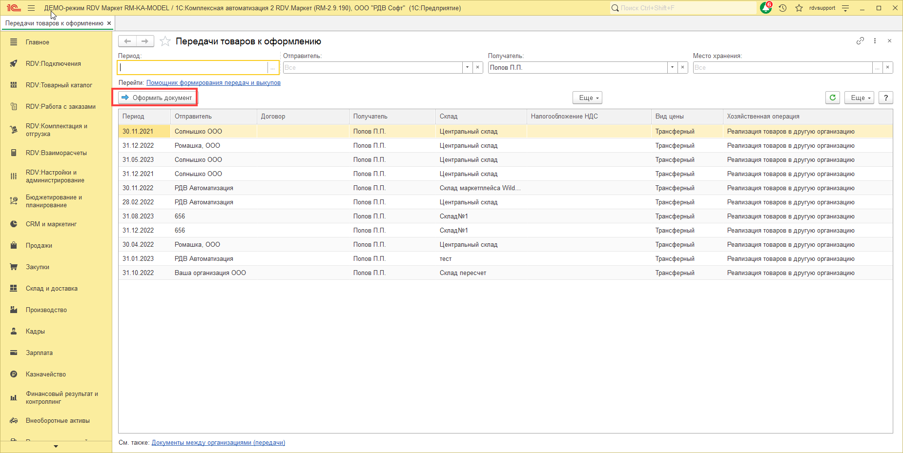 Чтобы отражения передачи товаров необходимо выбрать строку и нажать на кнопку "Оформить документ":