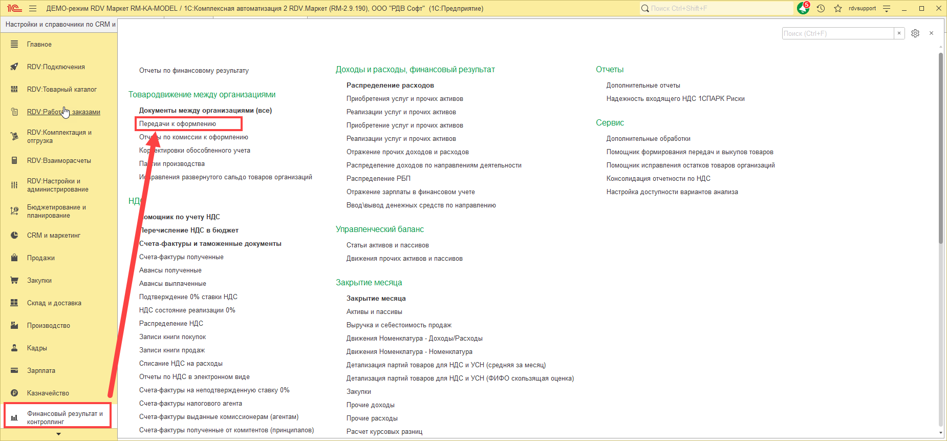 Для отражения перепродажи необходимо перейти в раздел "Финансовый результат и контроллинг" - "Передачи к оформлению".