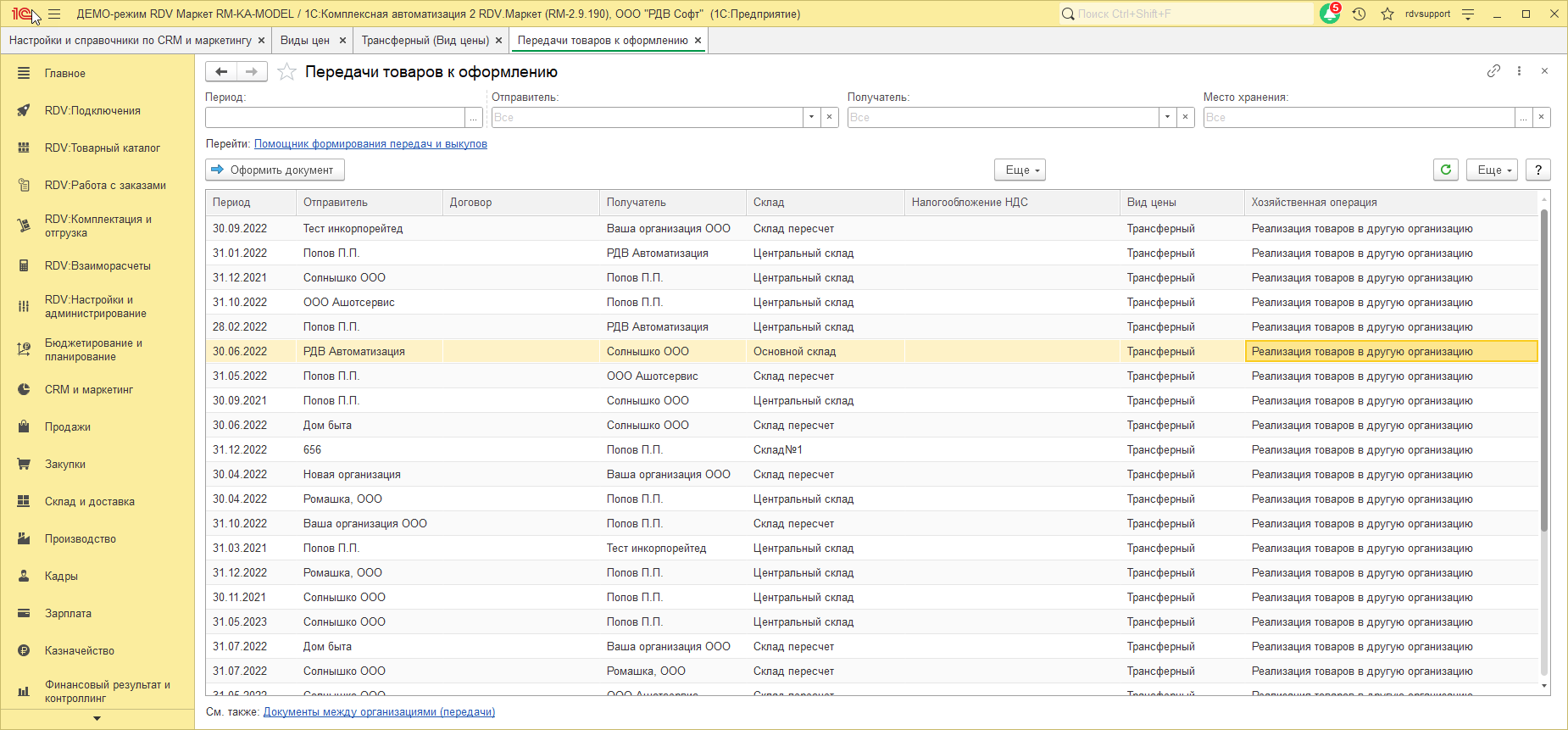 В начале каждого месяца, когда выполняется закрытие предыдущего периода, система самостоятельно находит товары, которые необходимо передать между организациями.