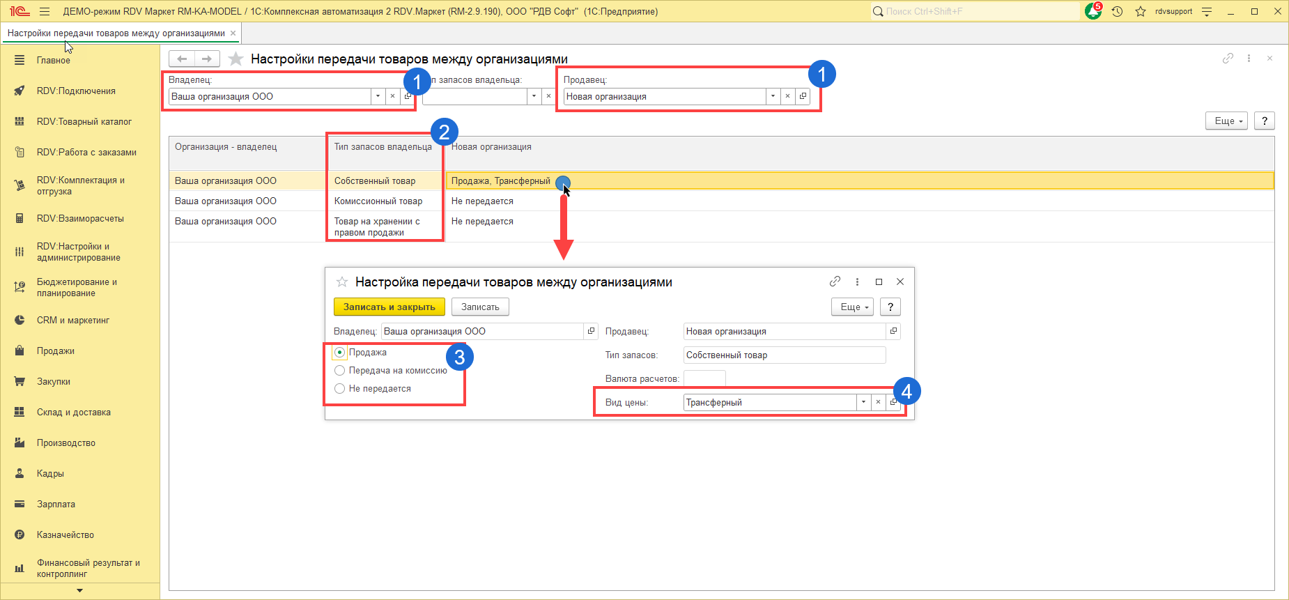 В этом случае при продаже товаров клиенту будет регистрироваться информация о том, что от имени одной организации был продан товар другой организации. На основании этих данных будет автоматически создан документ передачи товаров между организациями.