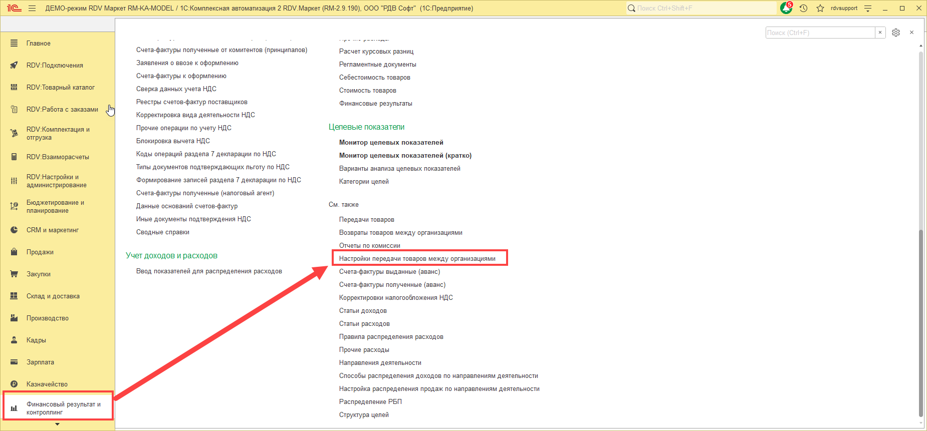 Настройка передач товаров выполняется в разделе "Финансовый результат и контроллинг" - "Настройка передачи товаров между организациями".
