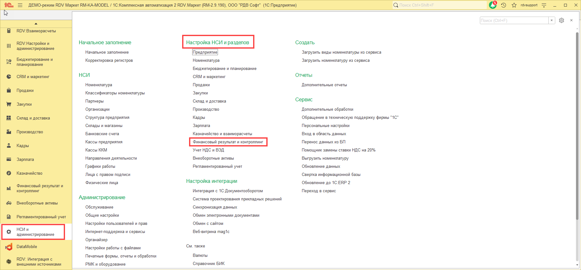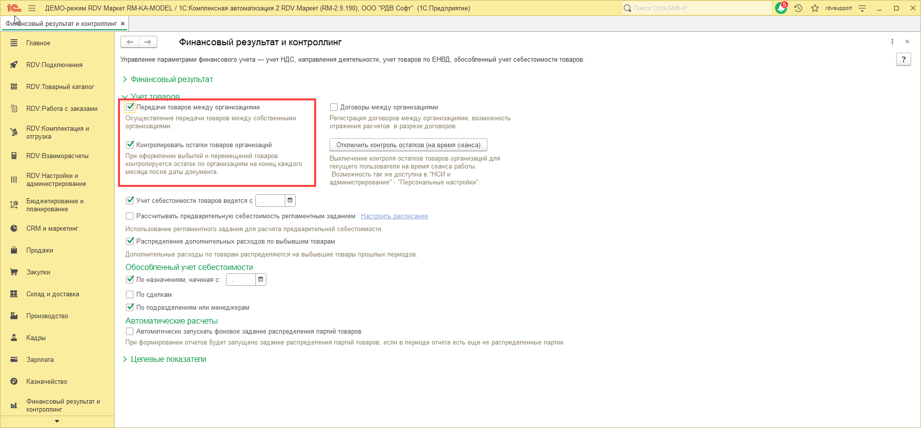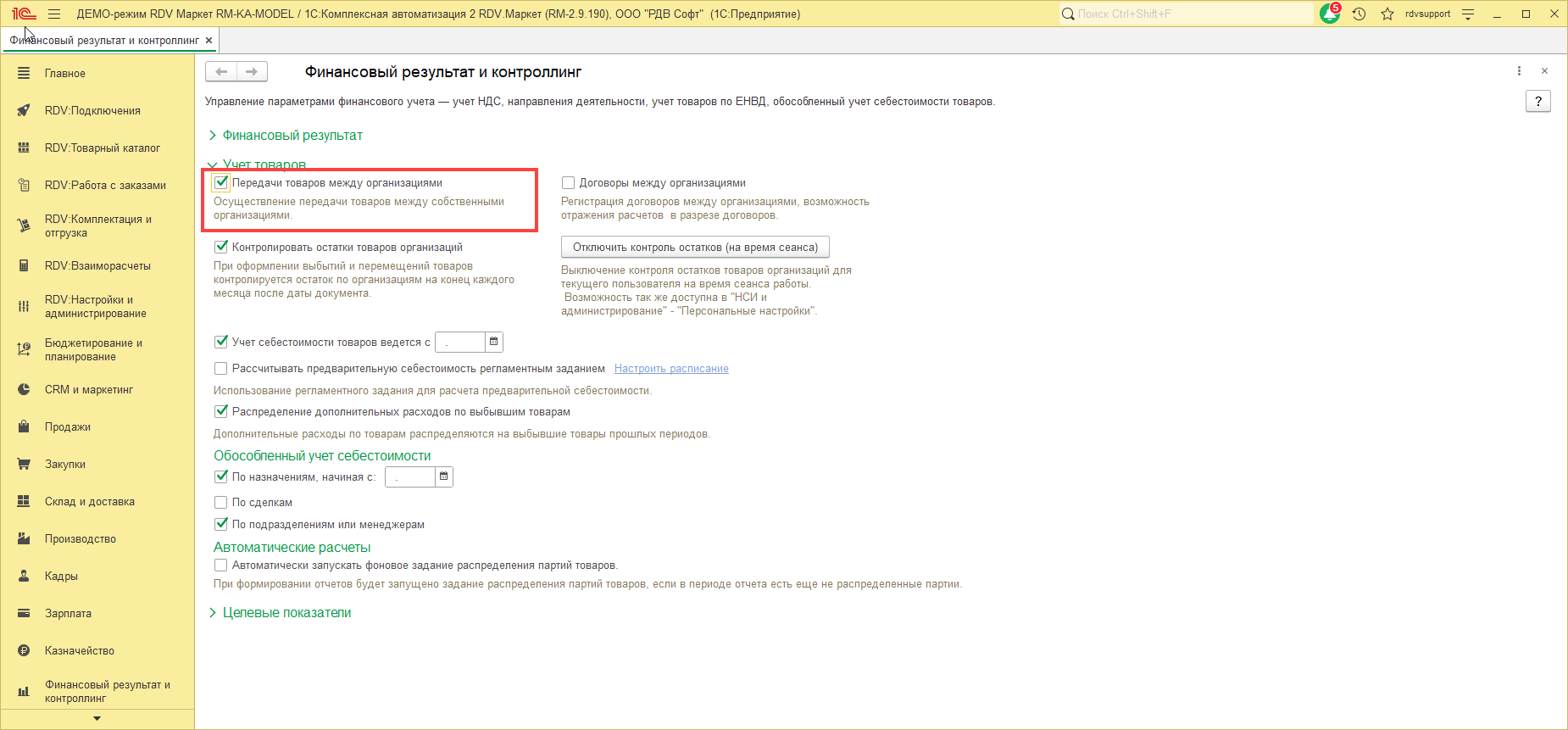 Для того, чтобы в процессе оперативной работы автоматически регистрировалась информация о продаже товаров другой организации, необходимо в разделе "НСИ и Администрирование" - "Настройка НСИ и разделов" - "Финансовый результат и контроллинг" установить флаг "Контролировать остатки товаров от организаций":