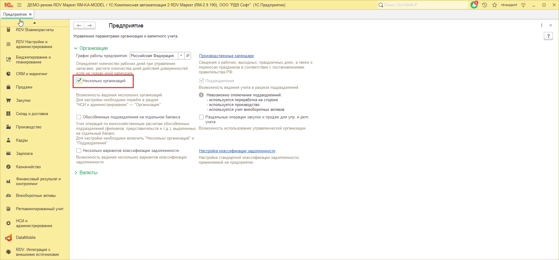 Для ведения учета по нескольким организациям необходимо в разделе "НСИ и Администрирование" - "Предприятие" установить флаг "Несколько организаций":