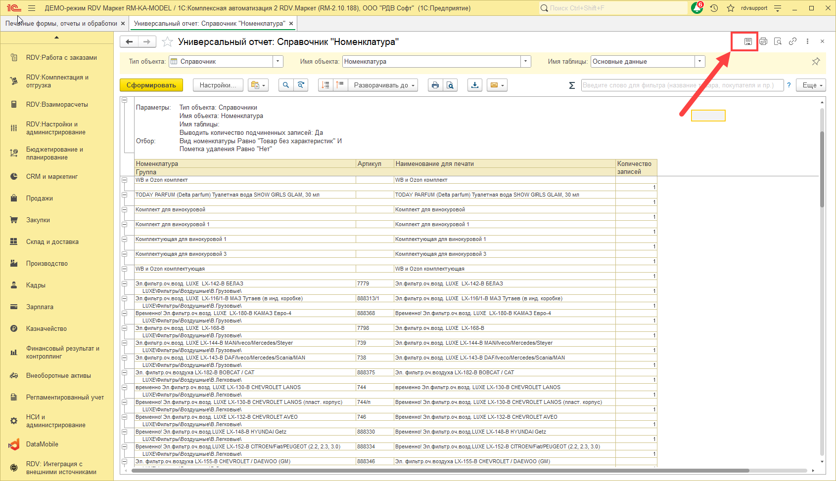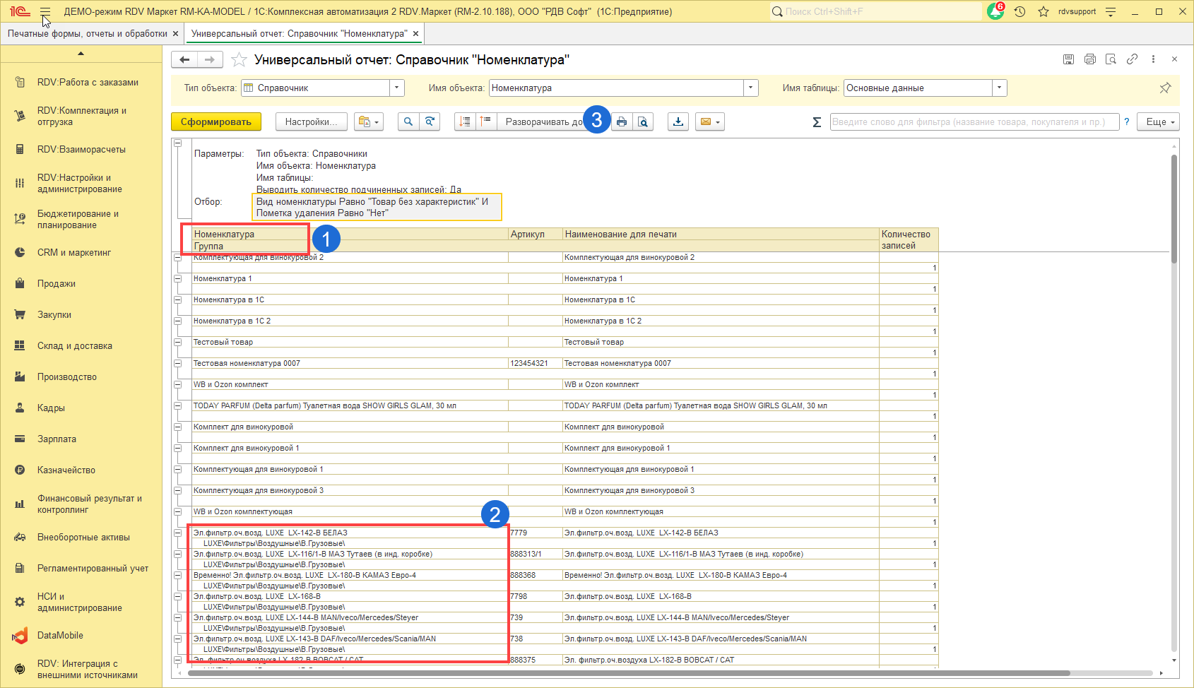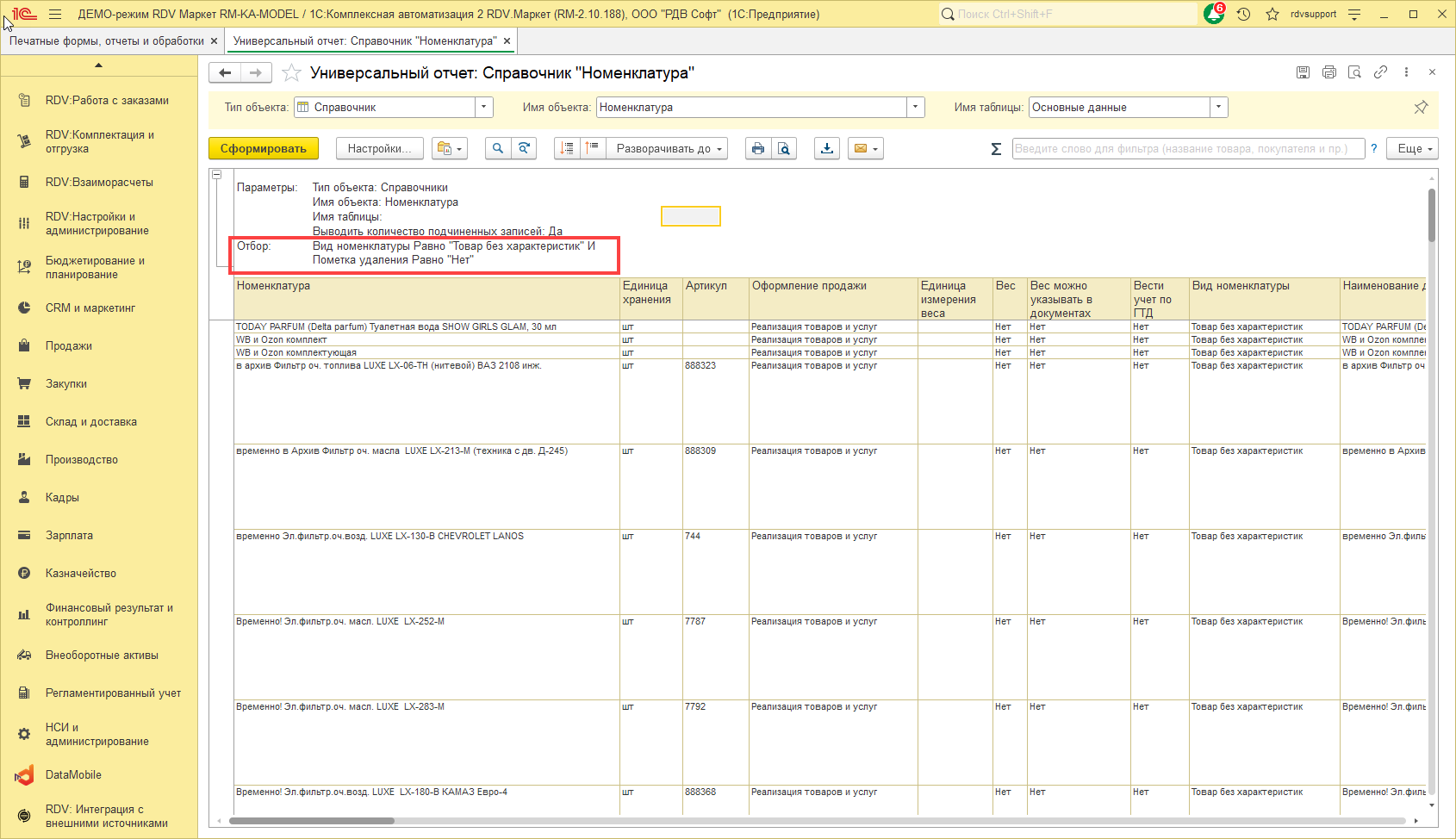 В данном случае были добавлены отборы по виду номенклатуры и отобрана номенклатура не помеченная на удаление (4).